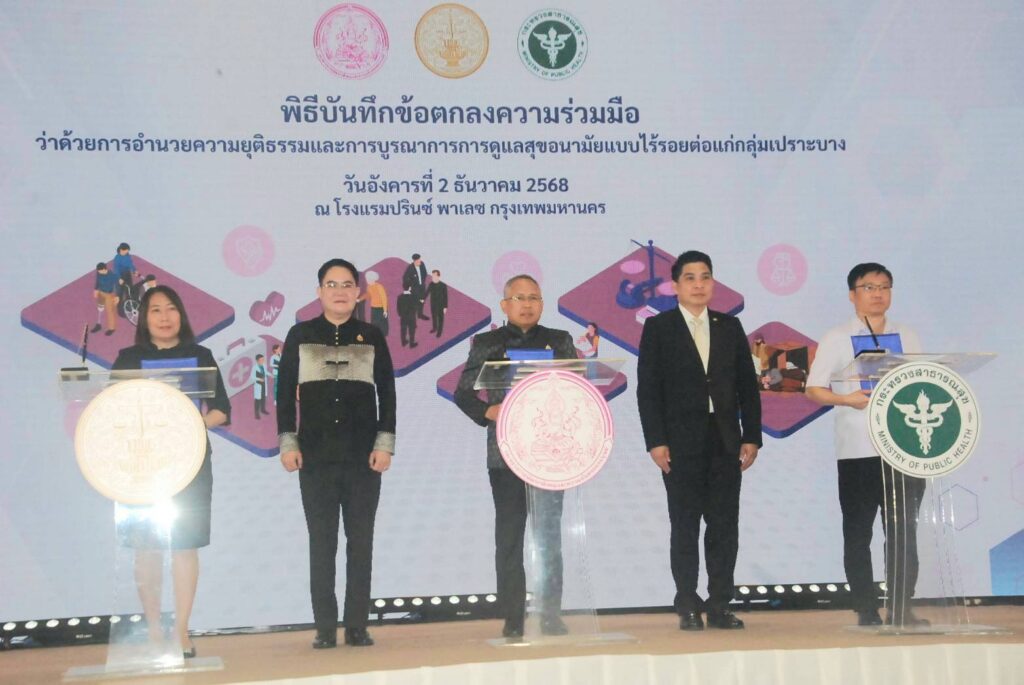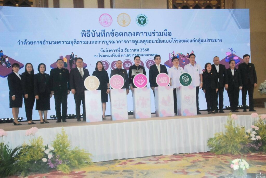 วันที่ 2 ธันวาคม 2568 : นายอัครา พรหมเผ่า รัฐมนตรีว่าการกระทรวงการพัฒนาสังคมและความมั่นคงของมนุษย์ (รมว.พม.) เป็นประธานในพิธีลงนามบันทึกข้อตกลงความร่วมมือ (MOU) ว่าด้วยการอำนวยความยุติธรรมและการบูรณาการการดูแลสุขอนามัยแบบไร้รอยต่อแก่กลุ่มเปราะบาง ระหว่างกระทรวงการพัฒนาสังคมและความมั่นคงของมนุษย์ (พม.) กระทรวงยุติธรรม (ยธ.) และกระทรวงสาธารณสุข (สธ.) พร้อมทั้งเปิดกิจกรรม Kick off การอำนวยความยุติธรรมและการบูรณาการการดูแลสุขอนามัยแบบไร้รอยต่อแก่กลุ่มเปราะบาง โดยมีนายกันตพงศ์ รังษีสว่าง ปลัดกระทรวงการพัฒนาสังคมและความมั่นคงของมนุษย์,นางพงษ์สวาท นีละโยธิน ปลัดกระทรวงยุติธรรม และนายแพทย์โสภณ เอี่ยมศิริถาวร รองปลัดกระทรวงสาธารณสุข ร่วมลงนาม MOU อีกทั้ง นายกองตรี ดร.ธนกฤต จิตรอารีย์รัตน์ เลขานุการรัฐมนตรีว่าการกระทรวงการพัฒนาสังคมและความมั่นคงของมนุษย์ ร่วมเป็นสักขีพยาน พร้อมด้วย นายยอดศักดิ์ รักษาแก้ว ที่ปรึกษารัฐมนตรีว่าการกระทรวงสาธารณสุข,นางสาวสุนีย์ ศรีสง่าตระกูลเลิศ รองปลัดกระทรวงการพัฒนาสังคมและความมั่นคงของมนุษย์ และคณะผู้บริหารกระทรวง พม. ยธ. และ สธ. เข้าร่วมงาน ณ โรงแรมปริ๊นซ์ พาเลซ กรุงเทพมหานคร