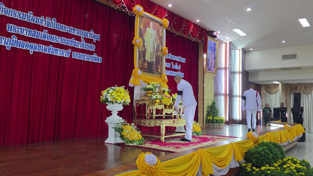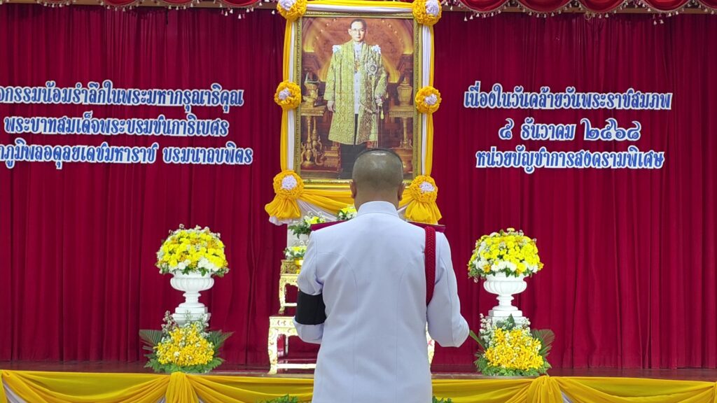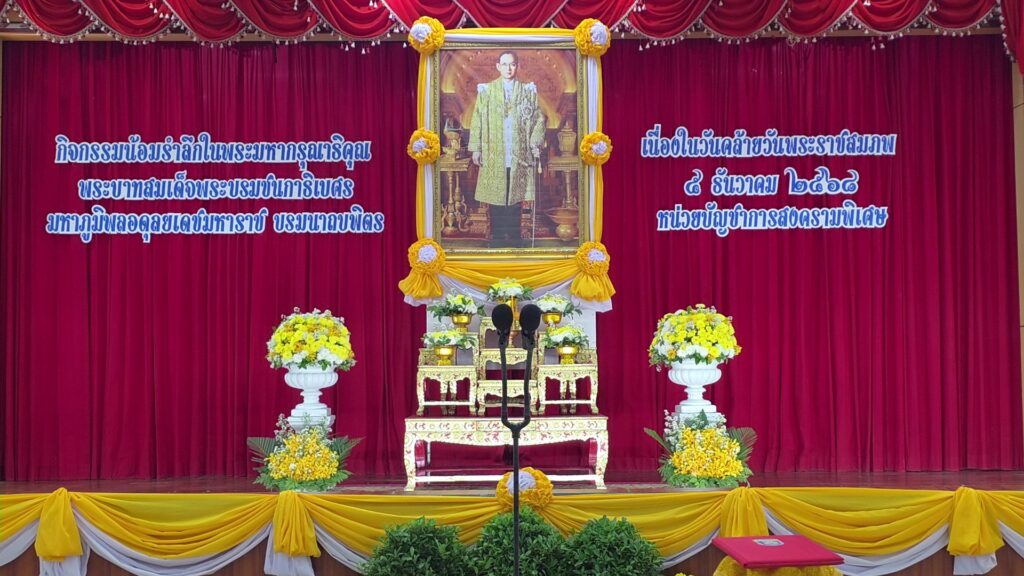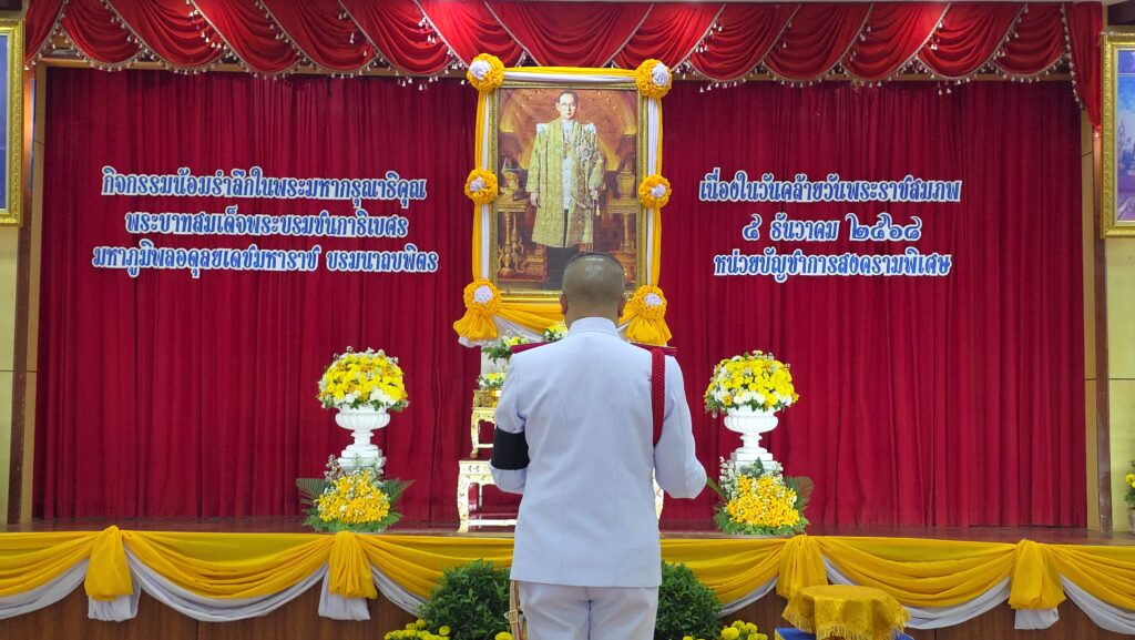 ที่ แหล่งสมาคมหน่วยบัญชาการสงครามพิเศษ ค่ายสมเด็จพระนารายณ์มหาราช จังหวัดลพบุรี พล.ท. อดุลย์ จันทร์มา ผู้บัญชาการหน่วยบัญชาการสงครามพิเศษ เป็นประธาน นำข้าราชการกำลังพล หน่วยขึ้นตรงทหารรบพเศษ ในพื้นที่จังหวัดลพบุรี พร้อมด้วย คณะสมาคมแม่บ้านแม่ทหารบก สาขาหน่วยบัญชาการสงครามพิเศษ และคณะครูนักเรียนโรงเรียนกองทัพบกอุปถัมภ์ค่ายนารายณ์ศึกษา เข้าร่วมพิธีถวายพานพุ่ม เพื่อน้อมรำลึกในพระมหากรุณาธิคุณ ของ พระบาทสมเด็จพระบรมชนกาธิเบศร มหาภูมิพลอดุลยเดชมหาราช บรมนาถบพิตร เนื่องในโอกาส วันคล้ายวันพระบรมราชสมภพ และวันพ่อแห่งชาติ 5 ธันวาคม 2568 เพื่อเป็นการแสดงออกซึ่งความจงรักภัคดี และน้อมรำลึกในพระมหากรุณาธิคุณ ที่พระองค์ได้ทรงปฏิบัติบำเพ็ญพระราชกรณียกิจน้อยใหญ่นานัปการ เพื่อประโยชน์อันมหาศาลของประเทศชาติ และประชาชนชาวไทยมาอย่างยาวนาน