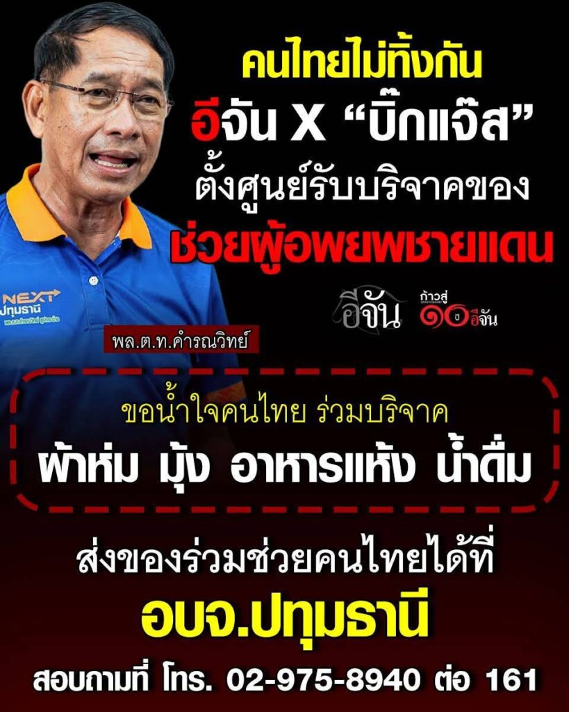 เมื่อเวลา 22.30 น. วันที่ 8 ธันวาคม 2568 ที่ มูลนิธิ มงคล-จงกล ธูปกระจ่าง ตำบล เชียงรากใหญ่ อำเภอสามโคก ปทุมธานี พล.ต.ท.คำรณวิทย์ ธูปกระจ่าง นายก อบจ.ปทุมธานีประชุมทีมงานโดยมีนาย นพพร ขาวขำ รองนายก อบจฯ นายอดิสร อยู่นานสมาชิกสภา อบจ.เขตเลือกตั้งที่ 5 นางสาวพรปริญญา ศรีจันทร์ สมาชิกสภา อบจ.เขตเลือกตั้งที่ 5 อ.คลองหลวง ทีมงาน ส.อบจ.ปทุมธานี ร่วมประชุมเตรียมความพร้อมการร่วมกับ เพจ อีจัน คนไทยไม่ทิ้งกัน! “อีจัน X บิ๊กแจ๊ส” ตั้งศูนย์รับบริจาคช่วยผู้ลี้ภัยชายแดน จากสถานการณ์ความเดือดร้อนของชาวบ้านและผู้ลี้ภัยบริเวณชายแดนที่ต้องหลบหนีเหตุปะทะกำลังวิกฤต เพราะศูนย์อพยพต้องรองรับคนจำนวนมาก ทั้งผู้สูงอายุและเด็ก ซึ่งขาดแคลนสิ่งของจำเป็นในการยังชีพอย่างหนัก ทั้งผ้าห่ม ที่นอน หมอน มุ้ง และอาหารแห้ง ด้วยจิตสำนึกแห่งการไม่ทอดทิ้งกัน “อีจัน” สื่อที่นำเสนอเรื่องราวความช่วยเหลือ ได้ผนึกกำลังกับ “บิ๊กแจ๊ส” พล.ต.ท.คำรณวิทย์ ธูปกระจ่าง นายกองค์การบริหารส่วนจังหวัด ปทุมธานี จัดตั้ง “ศูนย์รับบริจาคของ” ขึ้นเพื่อรวบรวมสิ่งของจากน้ำใจคนไทย และเตรียมส่งไปช่วยเหลือพี่น้องชาวไทยและผู้ที่ได้รับความเดือดร้อนตามแนวชายแดน อย่างเร่งด่วน โดยเฉพาะ ผ้าห่ม มุ้ง อาหารแห้ง น้ำดื่ม โดย ผู้มีจิตศรัทธาสามารถนำสิ่งของไปร่วมบริจาคได้ที่ องค์การบริหารส่วนจังหวัด (อบจ.) ปทุมธานี หรือสอบถามรายละเอียดเพิ่มเติมได้ที่หมายเลขโทรศัพท์ 02-975-8940 ต่อ 161 การรวมพลังของ “อีจัน” และ “บิ๊กแจ๊ส” ครั้งนี้ เป็นการย้ำถึงสปิริตที่ว่า “คนไทยไม่ทิ้งกัน” ขอเชิญชวนคนปทุมและคนไทย ทั่วประเทศ ร่วมกันส่งความช่วยเหลือ เพื่อให้ทุกคนที่กำลังเผชิญกับภัยพิบัติครั้งนี้ได้รับความปลอดภัยและมีชีวิตความเป็นอยู่ที่ดีขึ้น