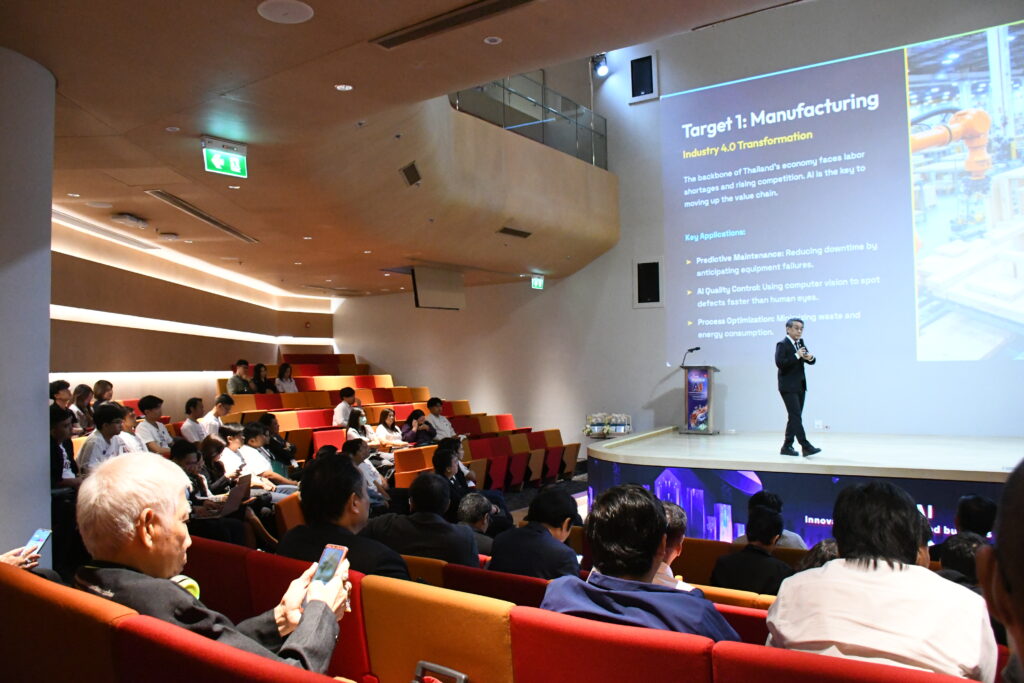 ภายในงานยังมีการบรรยายพิเศษ โดยเริ่มต้นจาก รศ.ดร.นพพร ลีปรีชานนท์ รองผู้อำนวยการ สำนักงานคณะกรรมการส่งเสริมวิทยาศาสตร์ วิจัยและนวัตกรรม (สกสว.) ที่มาเผยหัวข้อ “พลิกโฉมงานวิจัยสู่การสร้างผลงานด้าน AI ระดับเซียน ตามด้วย ดร.วิบูลย์ รักสาสน์เจริญผล รองเลขาธิการ สภาอุตสาหกรรมแห่งประเทศไทย ที่ได้นำเสนอ ‘แนวทางการส่งเสริมเทคโนโลยี AI ในอุตสาหกรรมของประเทศไทย’ และการชี้แจงประเด็นสำคัญจาก ดร.รัฐภูมิ ตู้จินดา รองผู้อำนวยการ หน่วยบริหารและจัดการทุนด้านการพัฒนากำลังคน และทุนด้านการพัฒนาสถาบันอุดมศึกษา การวิจัยและการสร้างนวัตกรรม (บพค.) เรื่อง ‘บทบาทของ บพค. ในการขับเคลื่อนการพัฒนากำลังคนทักษะสูงในอุตสาหกรรม AI’ ซึ่งเน้นย้ำถึงความร่วมมือของทุกภาคส่วนในการใช้ AI ขับเคลื่อนประเทศอย่างแท้จริง