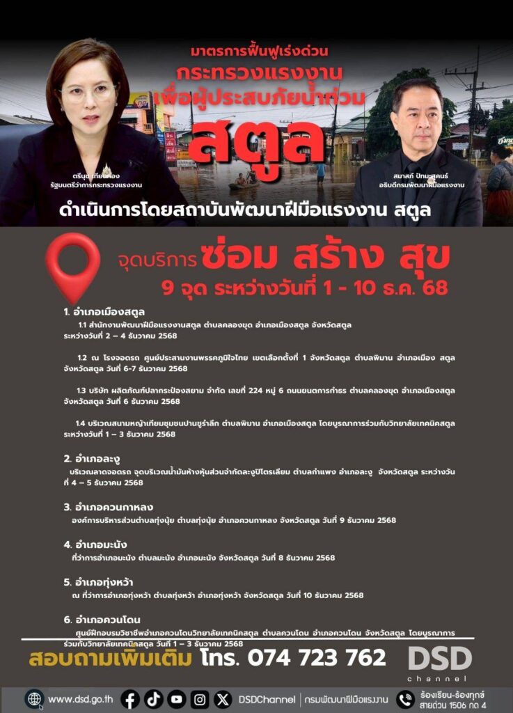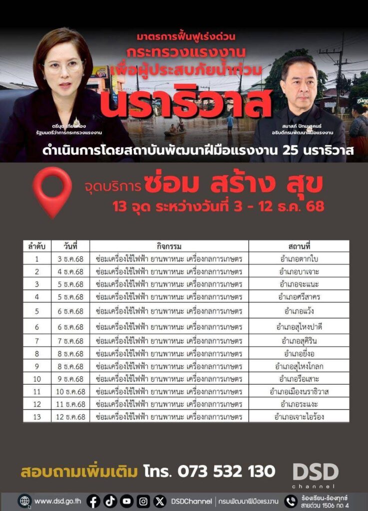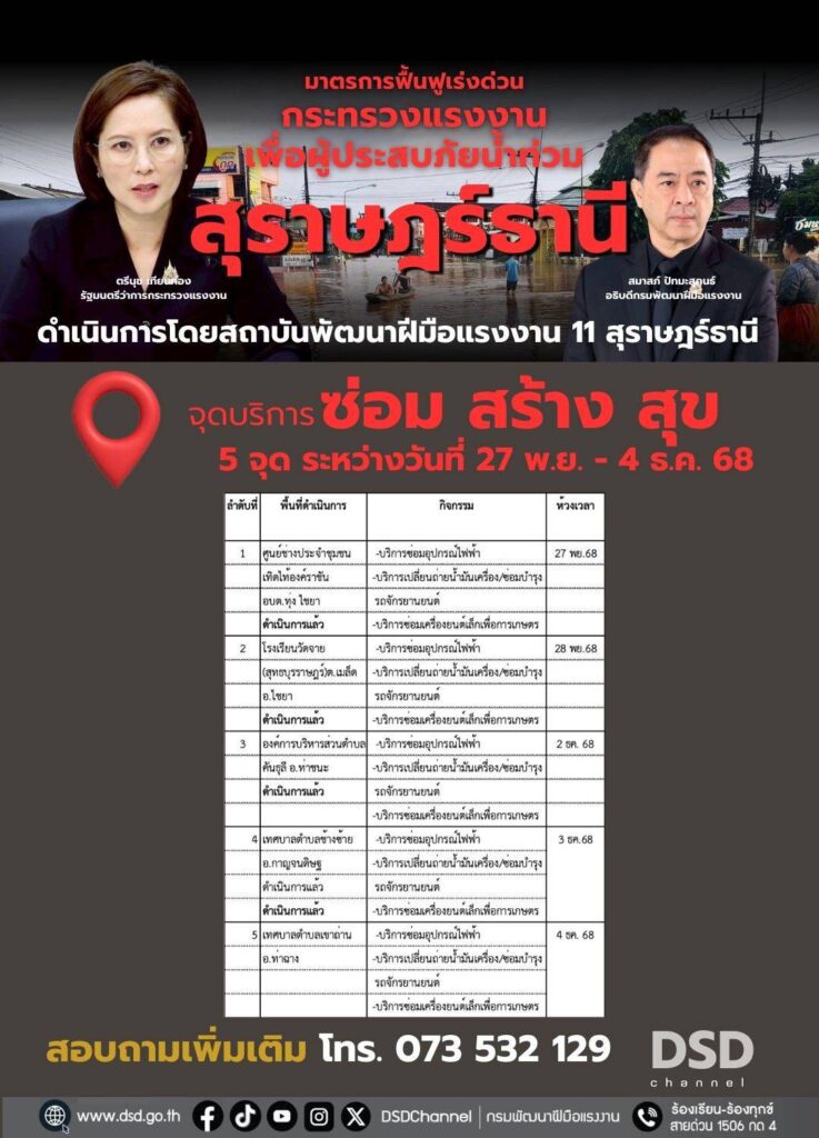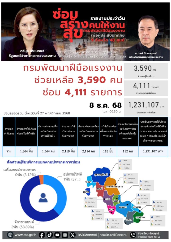 กรมพัฒนาฝีมือแรงงาน ได้ดำเนินการจัดตั้งศูนย์บริการ “ซ่อม สร้าง สุข” ในพื้นที่ 9 จังหวัดภาคใต้ เพื่อช่วยเหลือผู้ประสบอุทกภัยภาคใต้ ตามนโยบายมาตรการฟื้นฟูเร่งด่วนของนางสาวตรีนุช เทียนทอง รัฐมนตรีว่าการกระทรวงแรงงาน ปัจจุบันมีผู้เข้ารับบริการ จำนวน 3,590 คน ลดค่าใช้จ่ายในการซ่อมแซม จำนวน 1,231,107 บาท