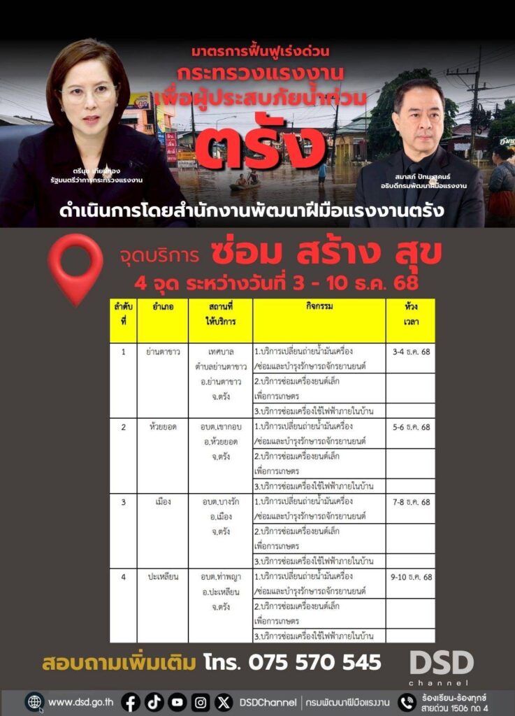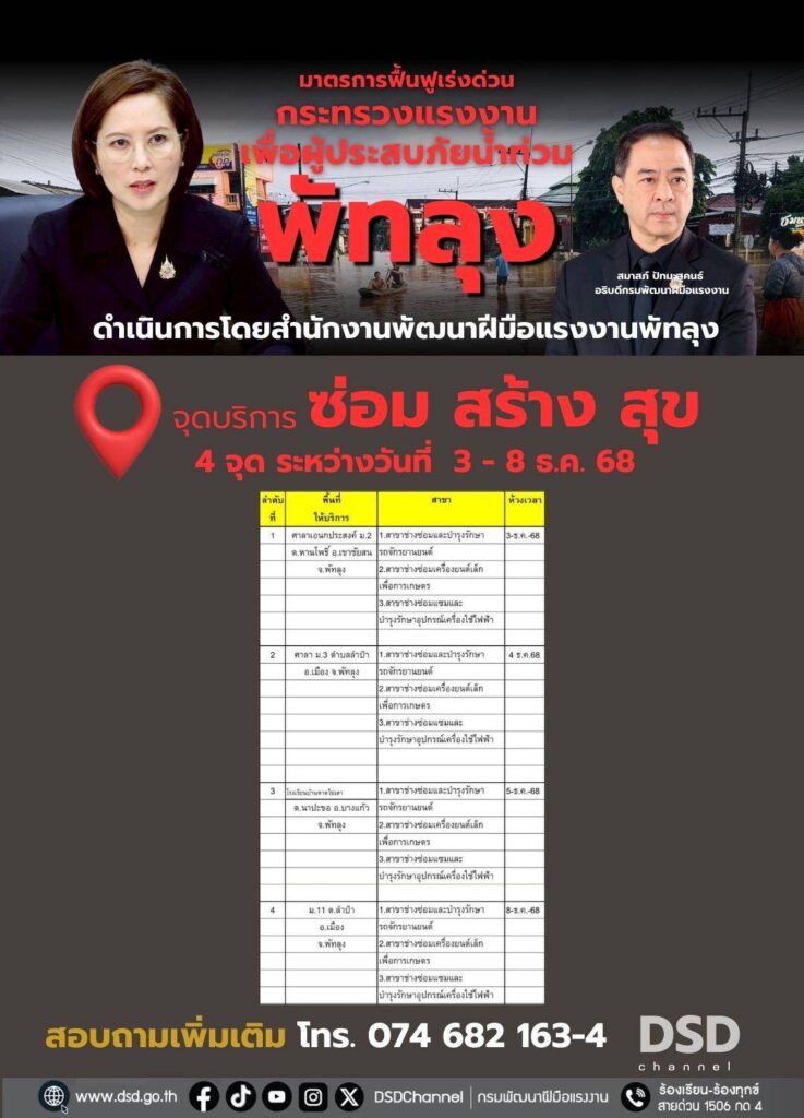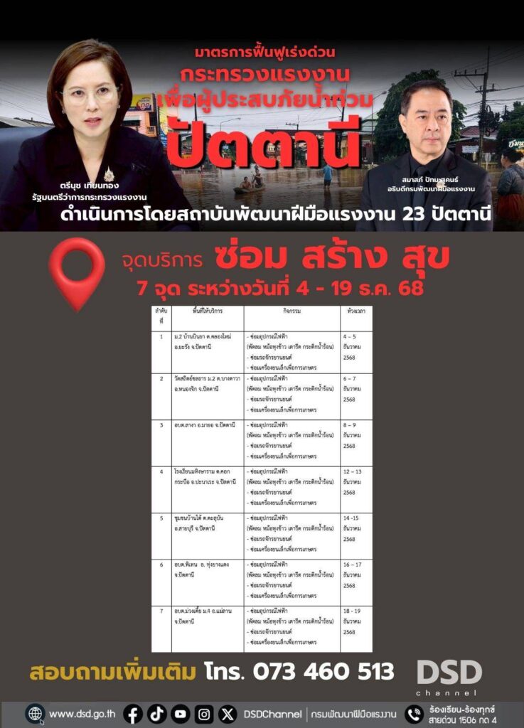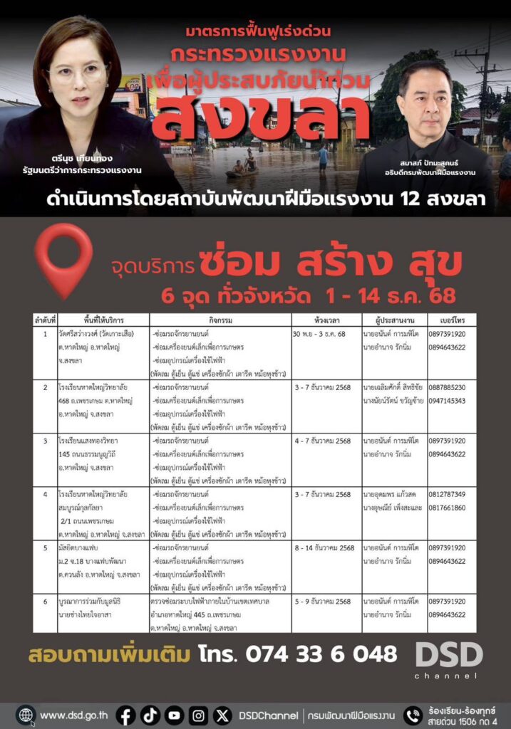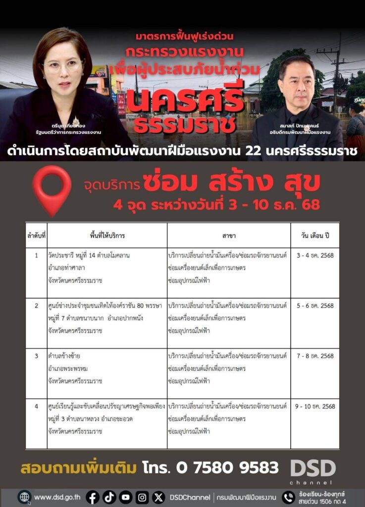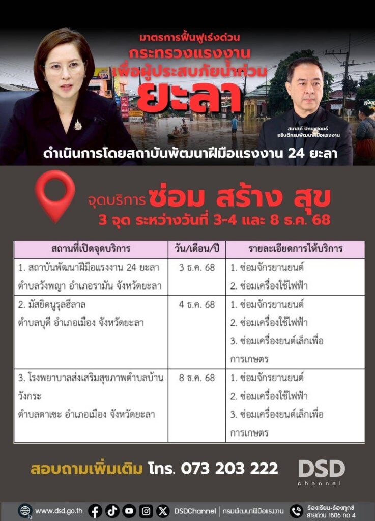 สำหรับผู้ประสบอุทกภัยทั้ง 9 จังหวัด ที่ได้รับความเดือดร้อน และมีรถจักรยานยนต์ หรืออุปกรณ์ไฟฟ้าที่ได้รับความเสียหาย สามารถติดต่อเข้ารับบริการได้ ณ ศูนย์บริการทั้ง 9 จังหวัด ซึ่งสามารถสอบถามได้ที่สถาบันและสำนักงานพัฒนาฝีมือแรงงานทั้ง 9 จังหวัดภาคใต้ หรือสอบถามรายละเอียดได้ที่เพจเฟซบุ๊กกรมพัฒนาฝีมือแรงงาน https://www.facebook.com/dsdgothai