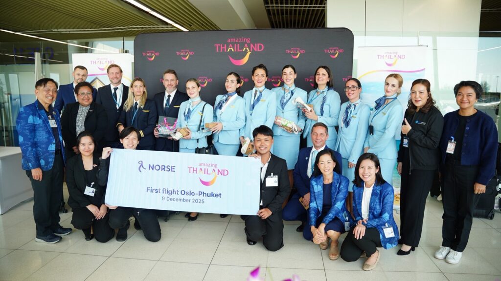 ณ ท่าอากาศยานภูเก็ต ต่อมาเที่ยวบินปฐมฤกษ์ N0 95 เส้นทางออสโล – ภูเก็ต ออกเดินทางจากท่าอากาศยานออสโล การ์เดอร์มอน ราชอาณาจักรนอร์เวย์ พร้อมความจุผู้โดยสาร 338 ที่นั่ง ถึงท่าอากาศยานภูเก็ตในวันที่ 9 ธันวาคม 2568 เวลา 14.30 น. โดยมีนางสาว สดุดี แสงนิล รองผู้อำนวยการภูมิภาคยุโรป ททท. นางสาวศิริวรรณ สีหาราช ผู้อำนวยการ ททท. สำนักงานภูเก็ต ร่วมต้อนรับ ทั้งนี้ เที่ยวบินดังกล่าวจะให้บริการสัปดาห์ละ 1 เที่ยวบินเช่นเดียวกัน