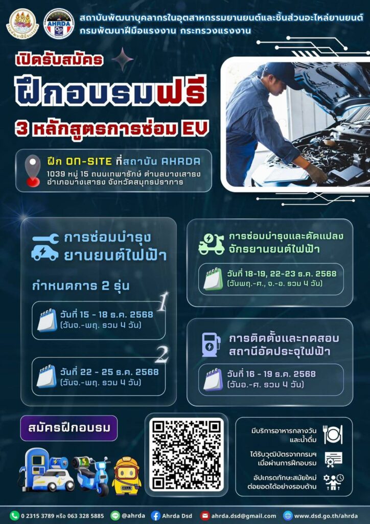 นายสมาสภ์ ปัทมะสุคนธ์ อธิบดีกรมพัฒนาฝีมือแรงงาน เปิดเผยว่า “ปัญหาใหญ่ของแรงงานไทย คือ ความสามารถและทักษะไปไม่ถึงตลาดแรงงาน เนื่องจากขาดทักษะในเรื่องเทคโนโลยีใหม่ๆ และอุตสาหกรรมแห่งอนาคต การ Up Skill / Re-Skill ให้แรงงานไทยก้าวทันเทคโนโลยี ด้วยการพัฒนาทักษะทางดิจิทัล ให้ตอบโจทย์ตลาดแรงงานในอนาคต จึงเป็นหนึ่งใน 5 นโยบายหลักของรัฐมนตรีว่าการกระทรวงแรงงาน หลักสูตรหลักๆ ที่มอบเป็นนโยบายเร่งด่วน คือ การพัฒนาสมรรถนะบุคลากรรองรับการขยายตัวของอุตสาหกรรมยานยนต์สมัยใหม่ ที่มุ่งเน้นความยั่งยืนและความชาญฉลาด อาทิ รถยนต์ไฟฟ้า (EV),รถยนต์ขับขี่อัตโนมัติ, รถยนต์เชื่อมต่ออัจฉริยะ (Connected Car) สอดคล้องกับความต้องการ จากกำลังแรงงานและสถานประกอบกิจการในอุตสาหกรรมยานยนต์ ที่ต้องการให้กรมพัฒนาฝีมือแรงงาน เร่งพัฒนาทักษะฝีมือและผลิตแรงงานด้านยานยนต์ไฟฟ้า (EV) ป้อนสู่อุตสาหกรรม ซึ่งปัจจัยเรียกร้องเกิดขึ้นจากที่ประชาชนเริ่มให้ความสนใจรถยนต์ไฟฟ้าและจักรยานยนต์ไฟฟ้ามากขึ้นเรื่อยๆ ทำให้ความต้องการแรงงานสูงตามไปด้วย จึงมอบหมายให้สถาบันพัฒนาบุคลากรในอุตสาหกรรมยานยนต์และชิ้นส่วนอะไหล่ยานยนต์ (AHRDA) หน่วยงานที่มีภารกิจพัฒนาทักษะแรงงานในสาขานี้ จัดฝึกหลักสูตรต่างๆ ที่เกี่ยวข้อง ล่าสุดเปิดอบรมอีก 3 หลักสูตร ได้แก่ หลักสูตรการซ่อมบำรุงรถยนต์ไฟฟ้า จำนวน 2 รุ่น รุ่นที่ 1 อบรมระหว่างวันที่ 15-18 ธ.ค. 68 รุ่นที่ 2 อบรมระหว่างวันที่ 22-25 ธ.ค.2568 หลักสูตรการซ่อมบำรุงและดัดแปลงจักรยานยนต์ไฟฟ้า อบรมระหว่างวันที่ 18-19 และ 22-23 ธ.ค.2568 หลักสูตรการติดตั้งและทดสอบสถานีอัดประจุไฟฟ้า อบรมระหว่างวันที่ 16-19 ธ.ค.2568 อบรมที่สถาบันพัฒนาบุคลากรในอุตสาหกรรมยานยนต์และชิ้นส่วนอะไหล่ยานยนต์ ถ.เทพารักษ์ ต.บางเสาธง อ.บางเสาธง จ.สมุทรปราการ