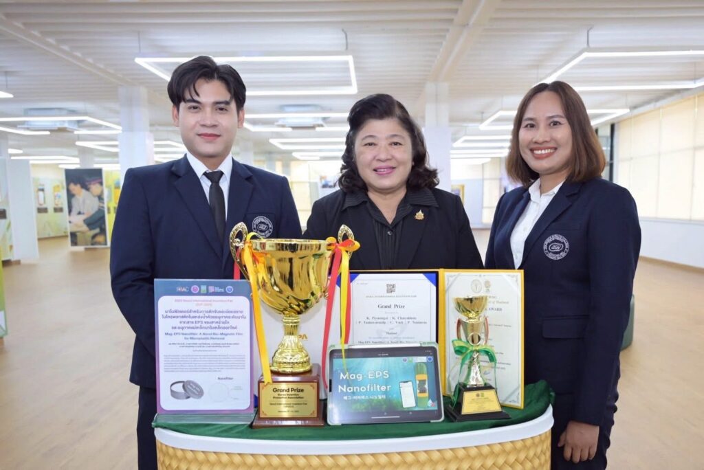 ผลงานระดับเยาวชน - ผลงานเรื่อง “นาโนฟิลเตอร์สำหรับการดักจับและย่อยสลายไมโครพลาสติกในแหล่งน้ำ ด้วยอนุภาคระดับนาโนจากสาร EPS ของสาหร่ายไกและอนุภาคแม่เหล็กนาโนเหล็กออกไซด์” (รางวัล Grand Prize) โดย นางสาวกีรติกานต์ ไชยโคตร จากโรงเรียนปรินส์รอยแยลส์วิทยาลัย