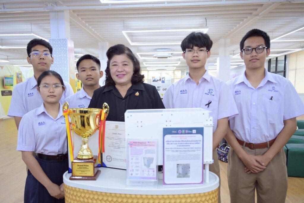 - ผลงานเรื่อง “เครื่องจ่ายยาอัจฉริยะที่ยืนยันตัวตนด้วยรหัส PIN หรือ QR Code สำหรับการรับยาผ่านการสั่งยาทางไกลโดยแพทย์“ (รางวัล Grand Prize) โดย นายพชรพล เดชศิริ จากโรงเรียนสกลราชวิทยานุกูล