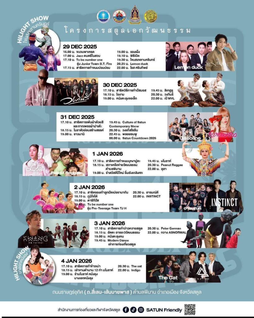 ด้าน นางสาวภัชกุล ตรีพันธ์ ท่องเที่ยวและกีฬาจังหวัดสตูล กล่าวว่า โครงการสตูลเอกวัฒนธรรม (Satun Friendly) จัดขึ้นตามนโยบายรัฐบาลและยุทธศาสตร์การท่องเที่ยวจังหวัด เพื่อสะท้อนความโดดเด่นของสตูลที่มีความหลากหลายทางศาสนา ชาติพันธุ์ และวัฒนธรรม ภายใต้การอยู่ร่วมกันอย่างสันติ โดยกิจกรรมหลักคือการจัดงาน Satun Friendly Countdown 2026 ระหว่างวันที่ 29 ธันวาคม 2568 – 4 มกราคม 2569 บริเวณถนนราษฎร์อุทิศ ถนนเลี่ยงเมือง (บายพาส) ตำบลพิมาน ภายในงานมีกิจกรรมตลอด 7 วัน อาทิ ขบวนพาเหรด 5 วัฒนธรรม การแสดงศิลปวัฒนธรรม ดนตรีจากศิลปินระดับประเทศและท้องถิ่น การสาธิตภูมิปัญญาชุมชน ร้านค้ากว่า 60 บูธ จุด Street Art และ Light Up ทั่วเมือง รวมถึงบริการรถรางชมเมืองยามค่ำคืน