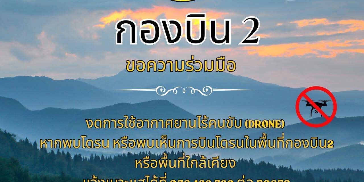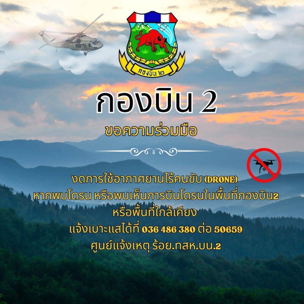 กองบิน 2 กองทัพอากาศ จึงขอความร่วมมือประชาชนทุกท่านที่พบเห็นหรือทราบเบาะแสเกี่ยวกับการบินของโดรน รวมทั้งผู้ที่บังคับโดรน ที่อาจฝ่าฝืนกฎหมาย