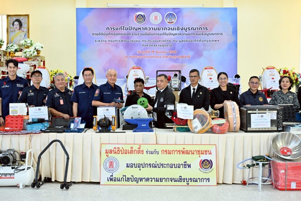 วานนี้ (วันศุกร์ที่ 19 ธันวาคม พ.ศ. 2568) มูลนิธิป่อเต็กตึ๊ง นำโดย นายสุรพงษ์ เตชะหรูวิจิตร กรรมการและรองเลขาธิการ พร้อมด้วย นายสุรพงศ์ เสรฐภักดี กรรมการและรองเหรัญญิก นางสาวศุภรัตน์ สมบัติเจริญไทย หัวหน้าแผนกส่งเสริมการศึกษาและอาชีพ และนางสาวเนาวรัตน์ วรรณศิริ หัวหน้าแผนกหน่วยแพทย์สงเคราะห์ชุมชน นำทีมลงพื้นที่มอบอุปกรณ์ประกอบอาชีพให้แก่ครัวเรือนยากจน ในพื้นที่จังหวัดสุราษฎร์ธานี (จังหวัดที่ 3 ของทางภาคใต้) จำนวน 28 ครัวเรือน มูลค่าทั้งสิ้น 690,450 บาท (หกแสนเก้าหมื่นสี่ร้อยห้าสิบบาทถ้วน) พร้อมจัดหน่วยแพทย์สงเคราะห์ชุมชน นำทีมแพทย์อาสาฯ เจ้าหน้าที่หน่วยแพทย์ ทีมบรรเทาสาธารณภัย (กู้ชีพ) และอาสาสมัครลงพื้นที่ให้บริการประชาชนฟรี ประกอบด้วย บริการตรวจรักษาโรคทั่วไป จ่ายยา ทันตกรรม คัดกรองเบาหวาน ตรวจวัดสายตาพร้อมแจกแว่น บริการตัดผมชาย-หญิง และกิจกรรมนันทนาการ โดยมี นายจุมพฏ วรรณฉัตรสิริ ผู้ว่าราชการจังหวัดสุราษฎร์ธานี และนายสงัด พืชพันธุ์ หัวหน้าผู้ตรวจราชการกรมการพัฒนาชุมชน เป็นประธานร่วมในพิธี คณะมูลนิธิกุศลศรัทธาสุราษฎร์ธานีเป็นผู้ประสานงานและร่วมในพิธี พร้อมด้วย อาสาสมัครศิลปินมูลนิธิป่อเต็กตึ๊ง นำโดย นายนพดล ทรงแสง (จิ้ม ชวนชื่น) นายธวัชชัย คชาอนันต์ (แฮ็ค ชวนชื่น)และ นายเกียรติภูมิ บันลือชัยฤทธิ์ (ภูมิ) ร่วมในพิธี ณ บริเวณหอประชุมที่ว่าการอำเภอท่าฉาง จังหวัดสุราษฎร์ธานี