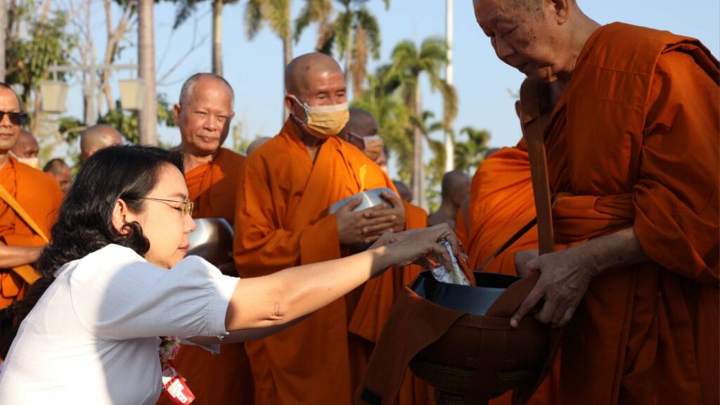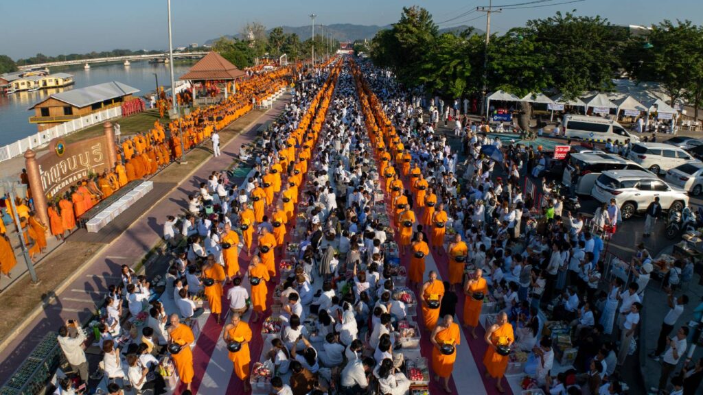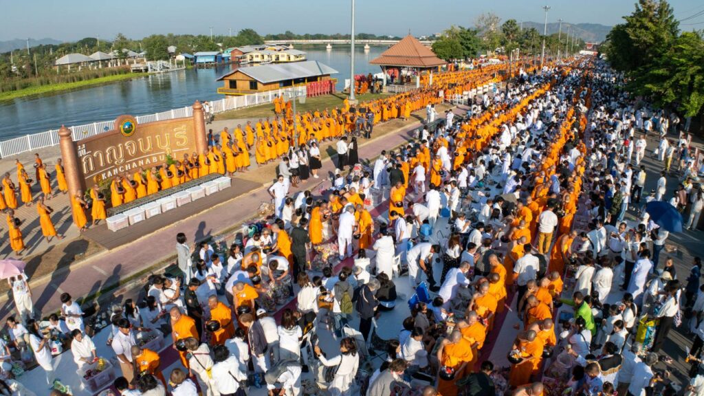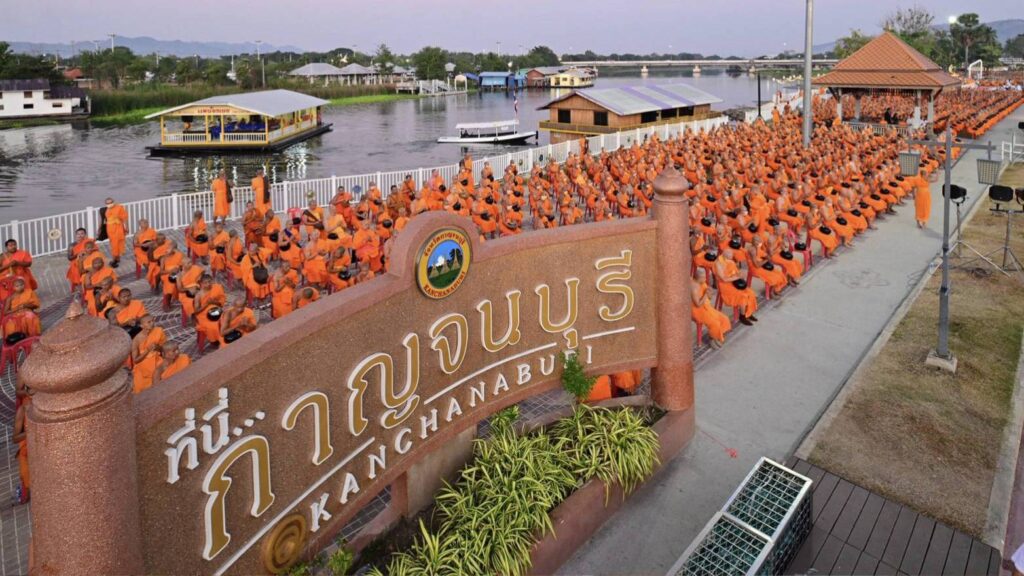บรรยากาศในพิธีมี พระเทพปริยัติโสภณ เจ้าคณะจังหวัดกาญจนบุรี เจ้าอาวาสวัดไชยชุมพลชนะสงคราม พระอารามหลวง เป็นประธานสงฆ์ในพิธีฯ และได้รับเกียรติจาก นางสาววริษฐา สงวนเสริมศรี ผู้ว่าราชการจังหวัดกาญจนบุรี เป็นประธานฝ่ายฆราวาส พร้อมด้วยนายวสันต์ ภูษิตกาญจนา นายกเทศมนตรีเมืองกาญจนบุรี ประธานอำนวยการจัดงาน พุทธศาสนิกชนได้พร้อมใจกันแสดงตนเป็นพุทธมามกะ อาราธนาศีล 5 เจริญสมาธิภาวนาถวายเป็นพระราชกุศลแด่ สมเด็จพระนางเจ้าสิริกิติ์ พระบรมราชินีนาถ พระบรมราชชนนีพันปีหลวง ประธานในพิธีนำถวายไทยธรรมเป็นสังฆทาน ประธานสงฆ์ได้เผดียงอาหารตักบาตรเพื่อนำไปมอบให้คณะสงฆ์ 323 วัด และเจ้าหน้าที่ทหารตำรวจในพื้นที่ 4 จังหวัดภาคใต้ อีกทั้งช่วยเหลือบรรเทาทุกข์ผู้ประสบภัยในทุกภูมิภาคของประเทศไทย จากนั้นคณะสงฆ์กว่า 10,000 รูปแปรแถวรับบิณฑบาต