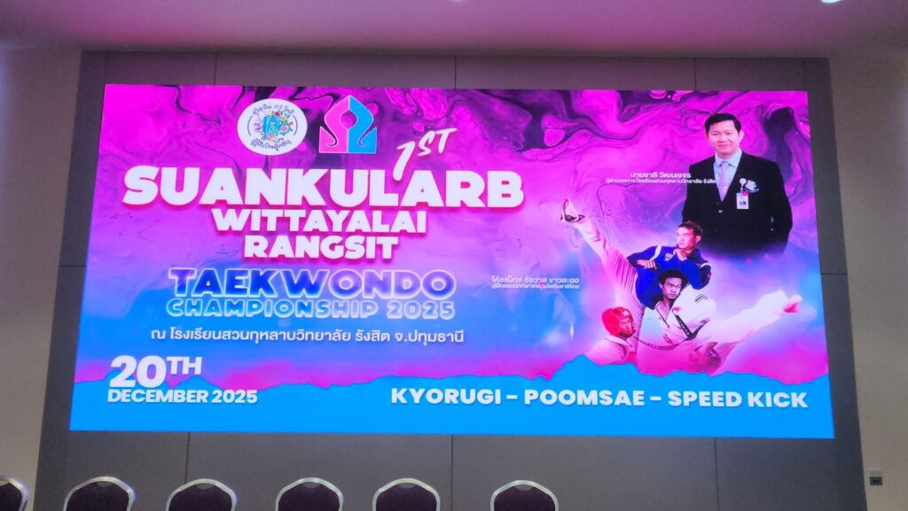 เมื่อเวลา 13.00 น. วันที่ 20 ธันวาคม 2568 ที่ ห้องประชุมแกรด์ กาล่า โรส ชั้น 4 อาคารสิรินธร 2 โรงเรียนสวนกุหลาบวิทยาลัย รังสิต ชมรมศิษย์เก่านักกีฬาเทควันโดโรงเรียนสวนกุหลาบวิทยาลัย รังสิต นำโดย พันตำรวจตรีชัชวาล ขาวลออ โค้ชนักกีฬาเทควันโดทีมชาติไทยและศิษย์เก่าโรงเรียนสวนกุหลาบวิทยาลัย รังสิต จัดการแข่งขัน 1st Suankularb Wittayalai Rangsit Taekwondo Championship 2025 ขึ้น โดยมี นายชาลี วัฒนเขจร ผู้อำนวยการโรงเรียนสวนกุหลาบวิทยาลัย รังสิต เป็นประธานเปิดการแข่งขัน พร้อมด้วย คณะผู้บริหารโรงเรียน ผู้แทนชมรมศิษย์เก่านักกีฬาเทควันโดโรงเรียนสวนกุหลาบวิทยาลัย รังสิต ผู้ปกครอง และ นักกีฬา ให้การต้อนรับ