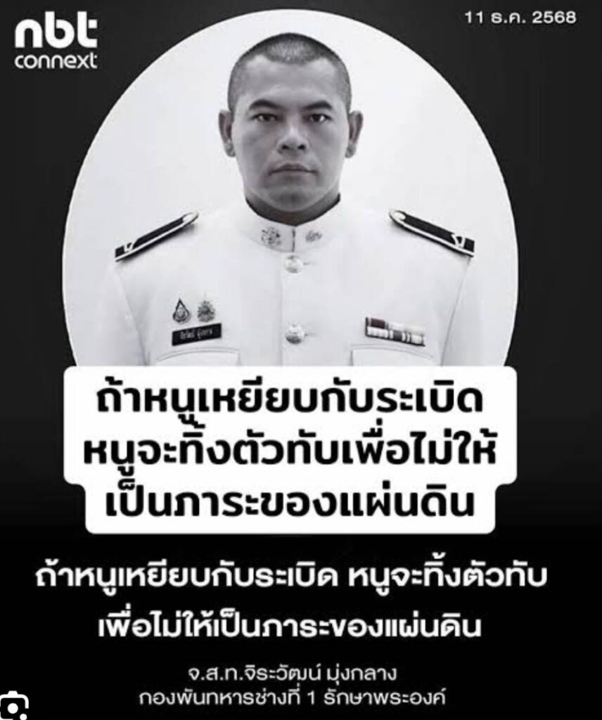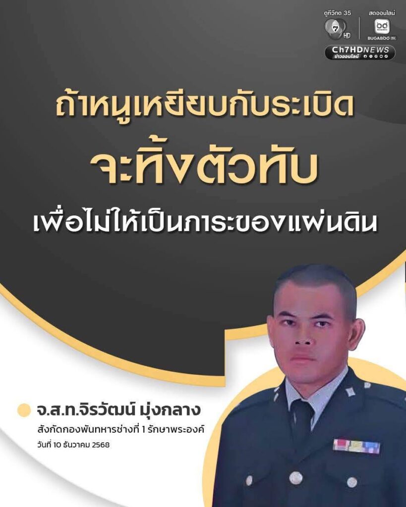 จ.ส.ต.จิรวัฒน์ มุ่งกลาง ในวัยเพียง 32 ปี ทหารช่างสนามผู้ปูทางความปลอดภัยให้เพื่อนทหาร ท่านได้เสียชีวิตขณะปฏิบัติหน้าที่ตรวจค้นทุ่นระเบิด ณ ช่องอานม้า จ.อุบลราชธานี เมื่อวันที่ 9 ธ.ค. 68 ที่ผ่านมา… ในวันที่จ่าทำภารกิจเพื่อชาติเสร็จสิ้น ท่านไม่ได้กลับบ้านอีกเลย..ทิ้งไว้เพียงคำมั่นสัญญาที่จะดูแลครอบครัวที่เปราะบางอยู่เบื้องหลัง