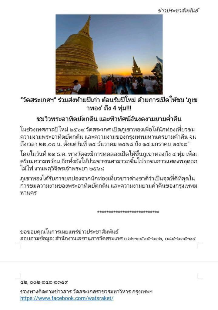 ในช่วงเทศกาลปีใหม่ ๒๕๖๙ วัดสระเกศ เปิดภูเขาทองเพื่อให้นักท่องเที่ยวชมความงามพระอาทิตย์ตกดิน และความงามของกรุงเทพมหานครยามค่ำคืน จนถึงเวลา ๒๒.๐๐ น. ตั้งแต่วันที่ ๒๕ ธันวาคม ๒๕๖๘ ถึง ๑๕ มกราคม ๒๕๖๙“