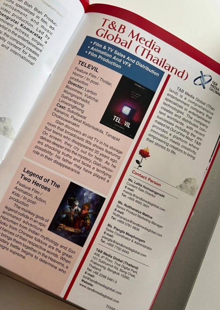 บริษัท ทีแอนด์บี มีเดีย โกลบอล (ประเทศไทย) จำกัด เดินหน้าผลักดันอุตสาหกรรมคอนเทนต์ไทยสู่ตลาดสากล นำผลงานภาพยนตร์และแอนิเมชันคุณภาพของบริษัท เข้าร่วมเสนอขายและเจรจาทางธุรกิจในงาน American Film Market (AFM) 2025 ณ รัฐแคลิฟอร์เนีย สหรัฐอเมริกา พร้อมเข้าร่วมงาน เทศกาลภาพยนตร์นานาชาติ Hainan Island International Film Festival ครั้งที่ 7 ณ สาธารณรัฐประชาชนจีน