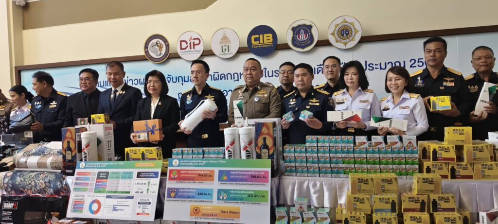 ของประชาชนในสังคมเป็นอย่างมาก โดยกรมศุลกากรได้บูรณาการการดำเนินงานร่วมกับกองบัญชาการตำรวจสอบสวนกลาง ในการเข้าตรวจค้นบ้านในพื้นที่อำเภอกระทุ่มแบน จังหวัดสมุทรสาคร จนสามารถจับกุมบุหรี่ไฟฟ้า หัวน้ำยาบุหรี่ไฟฟ้า และอื่น ๆ จำนวนกว่า 180,000 ชิ้น มูลค่ากว่า 41 ล้านบาทได้เป็นผลสำเร็จ ในช่วง 3 เดือนที่ผ่านมา สามารถจับกุมบุหรี่ไฟฟ้าได้แล้วเป็นจำนวน 414,974 ชิ้น มูลค่า 65 ล้านบาท รวมถึงสามารถจับกุมบุหรี่มวนได้ถึง 49 คดี มูลค่ารวม 41 ล้านบาท จำนวนรวม 5.3 ล้านมวน นอกจากนี้ ยังได้มีการตรวจพบและจับกุมก๊าซไนตรัสออกไซด์ หรือที่รู้จักกันในชื่อ ก๊าซหัวเราะ (Happy Gas) บรรจุในกระบอกอัดแรงดันสูง ปริมาณ 5,184 กระบอก (กระบอกละ 5 กิโลกรัม) มูลค่าความเสียหาย