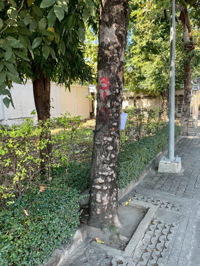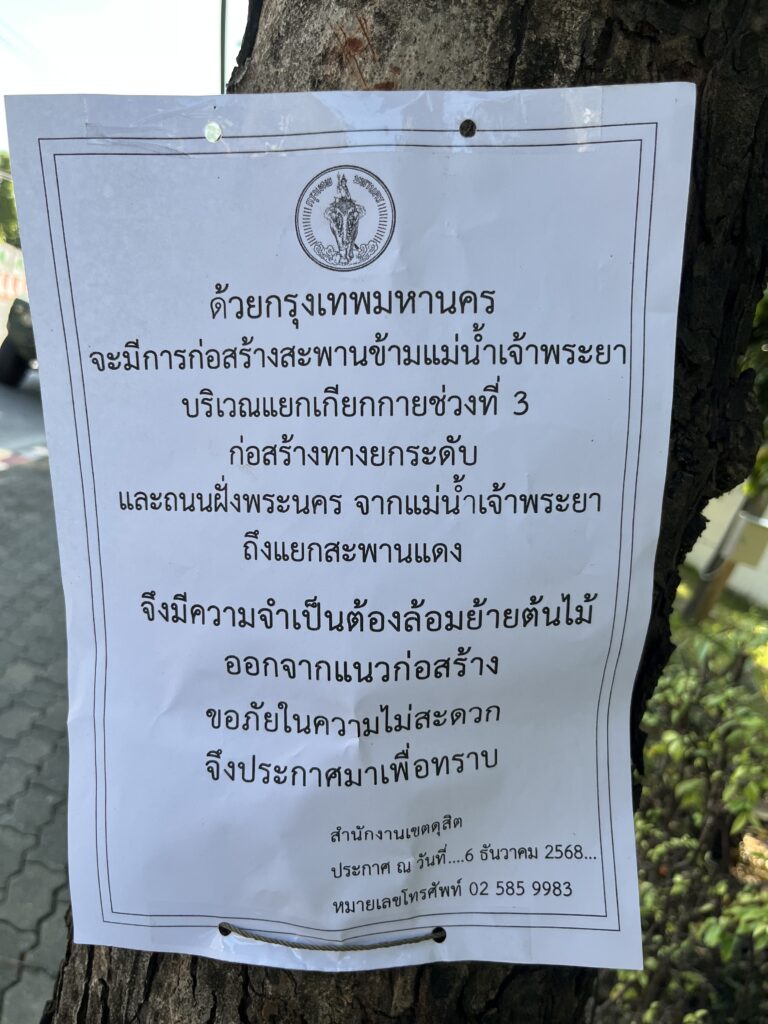ในการนี้ มีการติดป้ายประกาศจากกรุงเทพมหานคร ว่า มีความจำเป็นที่จะต้องล้อมย้ายต้นไม้ ออกจากแนวก่อสร้าง ขออภัยในความไม่สะดวก จึงเรียนประกาศมาทราบด้วยกัน สำนักงานเขตดุสิต ประกาศ ณ วันที่ 6 ธันวา 2568 หมายเลขโทรศัพท์ 02 585 9983 นั้น