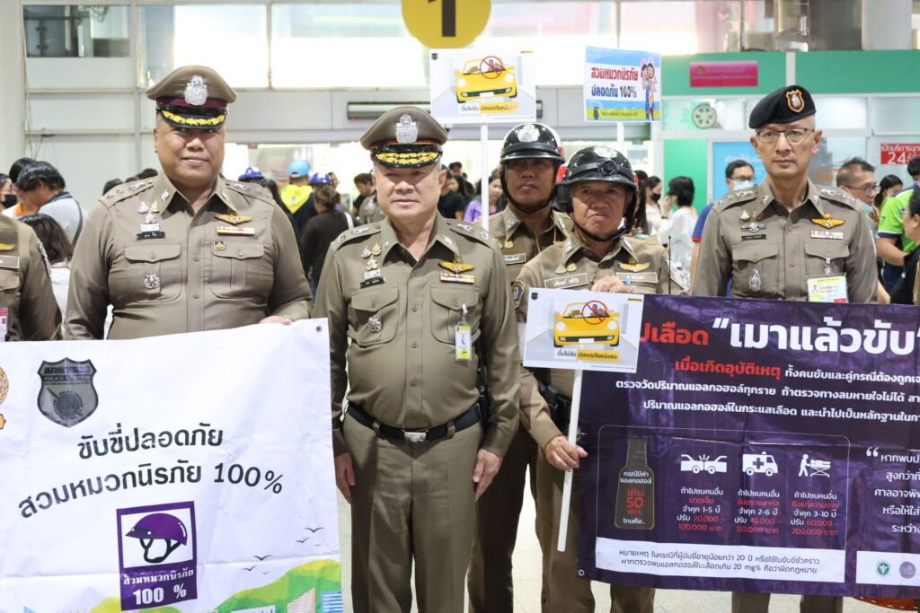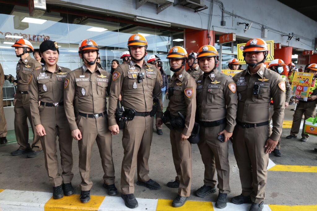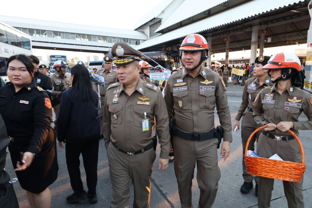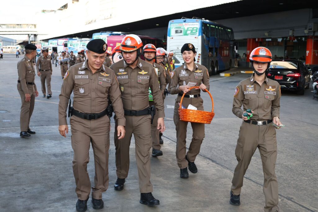ผบก.จร.,พ.ต.อ.ฐิรวิทย์ บุษบัน รอง ผบก.จร.,พ.ต.อ.ณัทศิต สัณห์ปภพ ผกก.5 บก.จร.,พ.ต.ท.ทศพร กลีบแก้ว รอง ผกก.5 บก.จร.,พ.ต.อ.เรวัฎ นูมหันต์ ผกก.1 บก.จร.,พ.ต.ท.มนตรี ศรีวัฒนฤทธิ์ รอง ผกก.6 บก.จร. ปฏิบัติหน้าที่ตรวจความเรียบร้อยภายในสถานีขนส่งหมอชิต 2 พร้อมร่วมกิจกรรมรณรงค์ “เมาไม่ขับ” ให้กับผู้ขับขี่รถโดยสารสาธารณะ และแจกขนม ลูกอม แบรนด์ ให้กับประชาชนที่เดินทางกลับภูมิลำเนา