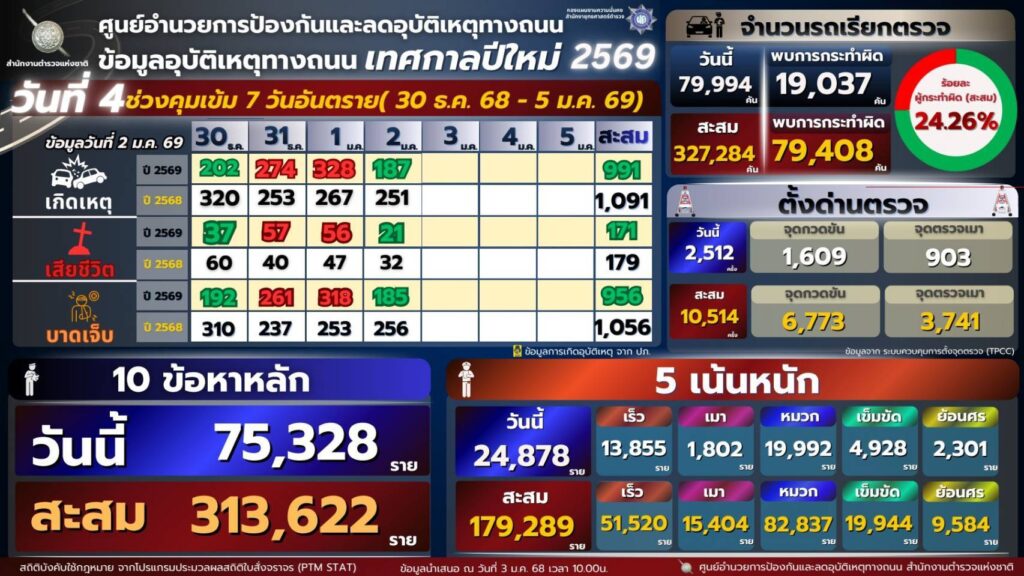 จากสถิติการเกิดอุบัติเหตุทางถนนในช่วง 4 วันของเทศกาลปีใหม่ 2569 คือวันที่ 30 ธันวาคม 2568 ถึงวันที่ 2 มกราคม 2569 ภาพรวมทั้งประเทศ เสียชีวิต 171 ราย บาดเจ็บ 956 ราย พบว่าลดลงจากช่วงเวลาเดียวกันของปีที่ผ่านมา โดยในส่วนของการบังคับใช้กฎหมายเพื่อป้องกันและลดอุบัติเหตุทางถนน ใน 10 ข้อหาหลักที่เป็นสาเหตุของการเกิดอุบัติเหตุ มีการจับกุมรวมทุกคดีใน 10 ข้อหาหลักถึง 313,622 ราย โดยเป็นการจับกุมเมาแล้วขับ รวมแล้วจำนวน 15,404 ราย ในจำนวนนี้เป็นการดำเนินคดีกับผู้กระทำผิดซ้ำเมาแล้วขับ จำนวน 100 ราย ซึ่งผู้กระทำความผิดฐานเมาแล้วขับซ้ำภายใน 2 ปี จะเข้าข่ายความผิดตามพระราชบัญญัติจราจรทางบก พ.ศ.2522 มีโทษสูงขึ้น จำคุกไม่เกิน 2 ปี ปรับตั้งแต่ 50,000–100,000 บาท และศาลสั่งพักใช้หรือเพิกถอนใบอนุญาตขับขี่