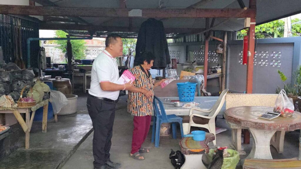 ลงพื้นที่ไปแจกแผ่นพับแนะนำตัวและเดินเคาะประตูบ้านพบปะเยี่ยมเยียนผู้เฒ่าผู้แก่ผู้สูงอายุ ให้การต้อนรับอย่างอบอุ่น
