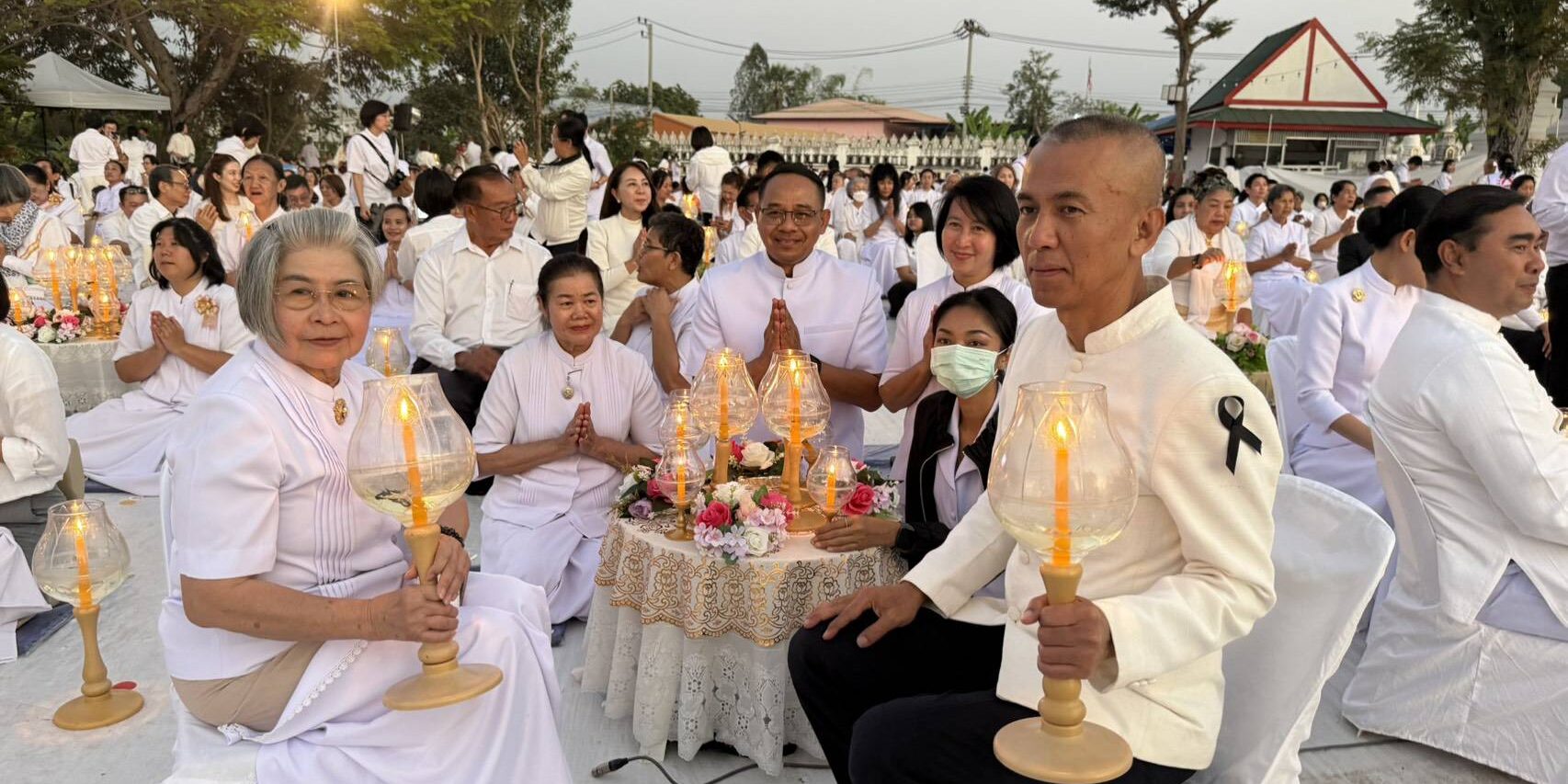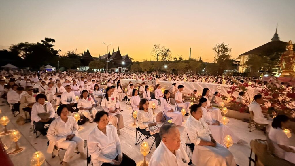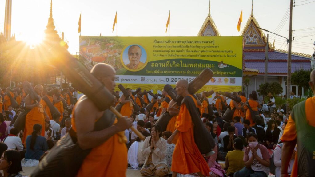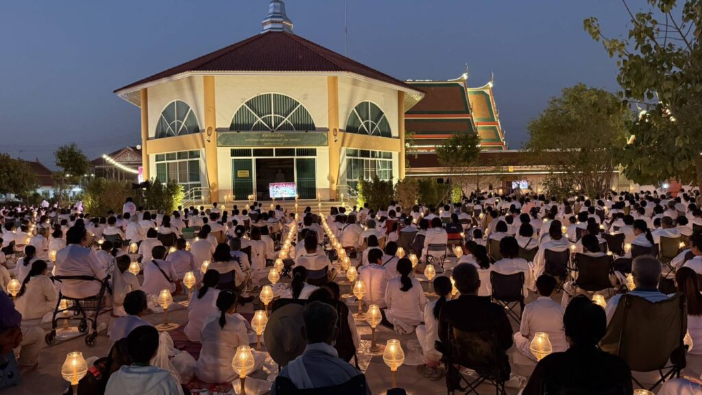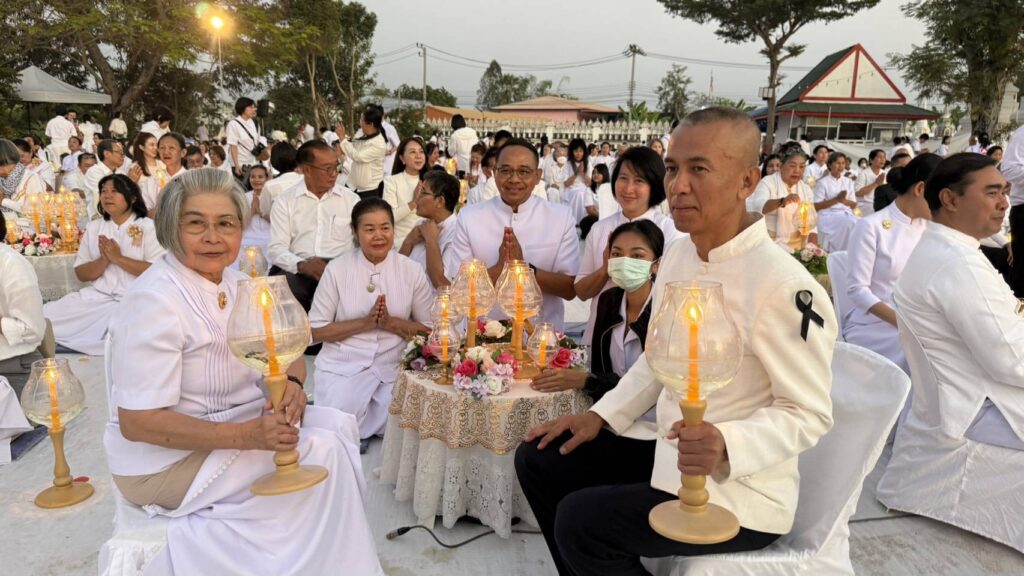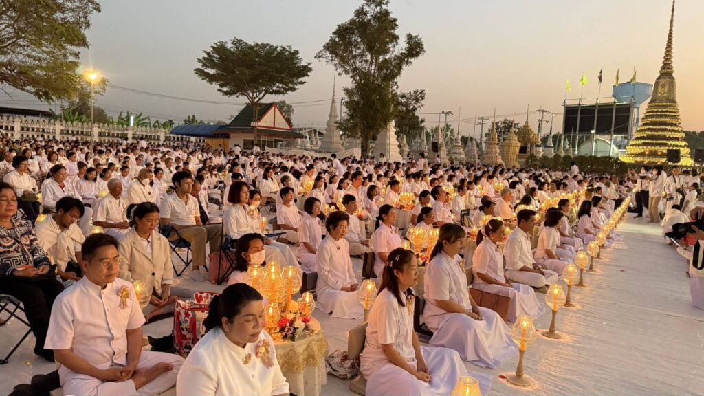สำหรับบรรยากาศในพิธี พระครูสมุห์ธานินทร์ ปุญฺญนนฺโท ผู้ช่วยเจ้าอาวาสวัดพระธรรมกาย นำคณะสงฆ์ธรรมยาตรา 1,142 รูปและสาธุชน เจริญสมาธิภาวนา อธิษฐานจิตอุทิศถวายเป็นพระราชกุศลแด่สมเด็จพระนางเจ้าสิริกิติ์ พระบรมราชินีนาถ พระบรมราชชนนีพันปีหลวง โดยมีนายณัฐพงษ์ สงวนจิตร ผู้ว่าราชการจังหวัดสุพรรณบุรี เป็นประธานฆราวาส ณ วัดสองพี่น้อง จ.สุพรรณบุรี ต่อมาพระปริยัติวรคุณ เจ้าคณะอำเภอสองพี่น้อง เจ้าอาวาสวัดสองพี่น้อง น้อมนำพวงมาลัยถวายบูชาพระบรมสารีริกธาตุ และรูปหล่อพระมงคลเทพมุนี (สด จนฺทสโร) และนำคณะสงฆ์ธรรมยาตรา 1,142 รูป พร้อมด้วยพุทธศาสนิกชนจุดประทีปถวายเป็นพุทธบูชา และบูชาธรรมพระมงคลเทพมุนี (สด จนฺทสโร)