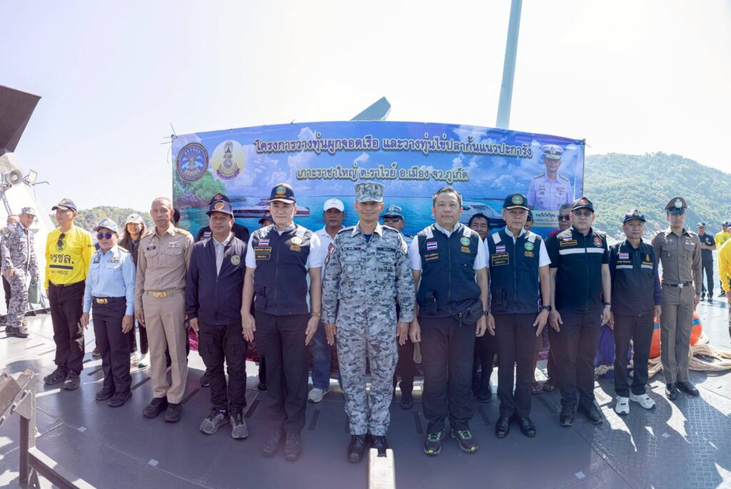 บริเวณพื้นที่ทางทะเลรอบ เกาะราชาใหญ่ จังหวัดภูเก็ต พลเรือโท วีรุดม ม่วงจีน ผู้อำนวยการศูนย์อำนวยการรักษาผลประโยชน์ของชาติทางทะเล ภาค ๓ เป็นประธานในพิธีปล่อยทุ่นผูกเรือลงสู่ทะเล เพื่อใช้ในการอนุรักษ์ทรัพยากรทางทะเลและป้องกันการทำลายแนวปะการังน้ำตื้น โดยมี นายนิรัตน์ พงษ์สิทธิถาวร ผู้ว่าราชการจังหวัดภูเก็ต พร้อมด้วยส่วนราชการ หน่วยงานที่เกี่ยวข้อง ภาคเอกชน และนักดำน้ำจิตอาสา เข้าร่วมกิจกรรม การจัดกิจกรรมในครั้งนี้ สืบเนื่องจาก ผู้อำนวยการศูนย์อำนวยการรักษาผลประโยชน์ของชาติทางทะเล ภาค ๓ ได้อนุมัติให้
