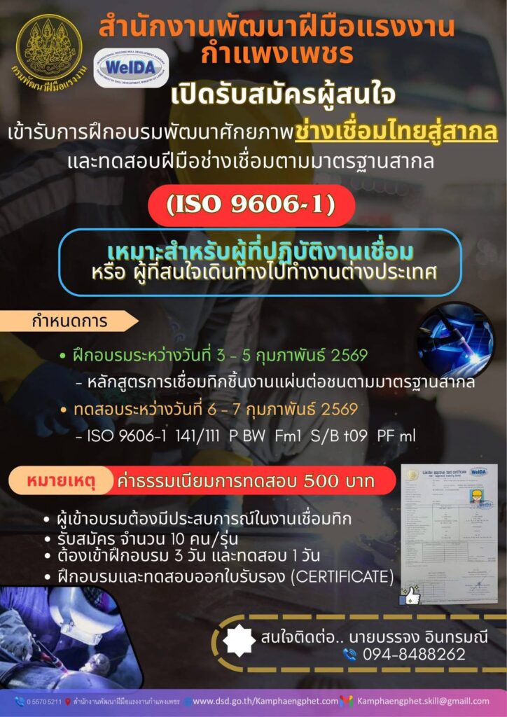 กรมพัฒนาฝีมือแรงงาน โดยสำนักงานพัฒนาฝีมือแรงงานกำแพงเพชร เปิดรับสมัครผู้สนใจเข้ารับการฝึกอบรมพัฒนาศักยภาพช่างเชื่อมไทยสู่สากลและทดสอบฝีมือช่างเชื่อมตามมาตรฐานสากล ISO 9606-1 ภายใต้โครงการ “ช่างเชื่อมไทยสู่สากล“