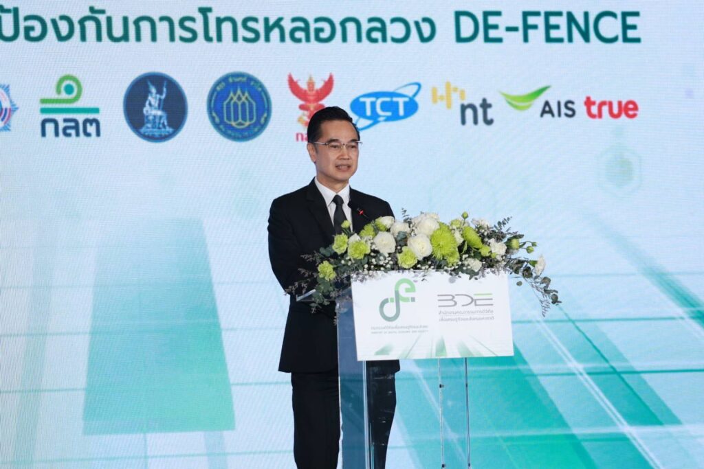 นายเวทางค์ พ่วงทรัพย์ เลขาธิการคณะกรรมการดิจิทัลเพื่อเศรษฐกิจและสังคมแห่งชาติ (BDE) และโฆษกกระทรวงดิจิทัลเพื่อเศรษฐกิจและสังคม (DE) เปิดเผยว่า “กระทรวงดิจิทัลเพื่อเศรษฐกิจและสังคม (DE) ร่วมกับสำนักงานคณะกรรมการดิจิทัลเพื่อเศรษฐกิจและสังคมแห่งชาติ (BDE) ซึ่งเป็นหน่วยงานของรัฐบาลที่มีพันธกิจในการส่งเสริมและพัฒนาดิจิทัลเพื่อขับเคลื่อนเศรษฐกิจและสังคมไทยให้เติบโตอย่างยั่งยืน โดยเน้นการพัฒนาเทคโนโลยีดิจิทัล และการปรับใช้โครงสร้างพื้นฐานดิจิทัล รวมถึงการสร้างความมั่นคงในโลกไซเบอร์ ได้เดินหน้าปราบปรามภัยออนไลน์อย่างเต็มกำลัง ซึ่งในวันนี้เป็นการเปิดตัวแพลตฟอร์มป้องกันการโทรหลอกลวง หรือ DE-FENCE ซึ่งเป็นเครื่องมือดิจิทัลที่ออกแบบมาเพื่อสกัดกั้นและแจ้ง “กัน-ก่อน-ลวง” เตือนภัยจากมิจฉาชีพที่มีกลโกงรูปแบบต่าง ๆ เพื่อเป็นการป้องกันมิจฉาชีพที่ใช้การโทรและการส่ง SMS หลอกลวงประชาชน ควบคู่กับมาตรการลงทะเบียนผู้ให้บริการส่ง SMS ใหม่ทั้งระบบ ซึ่งต้องมีการลงทะเบียนทุก ๆ ปี เพื่อให้สามารถระบุว่า ผู้ให้บริการและผู้ส่ง SMS คือใคร รวมทั้งการลงทะเบียนการส่ง SMS แนบลิงก์ จะต้องระบุรายละเอียดของข้อความและลิงก์ เพื่อให้ผู้ให้บริการเครือข่ายตรวจสอบลิงก์ก่อนที่จะส่ง SMS ไปยังผู้ใช้บริการ”