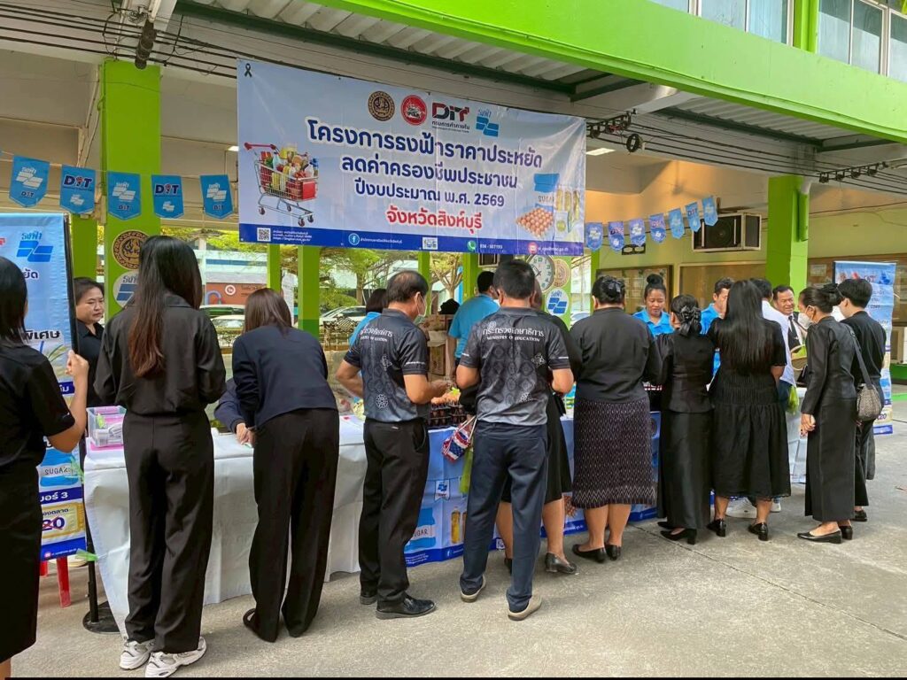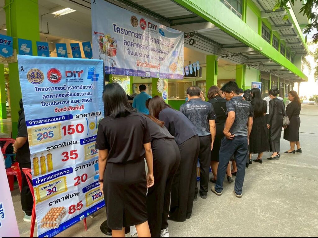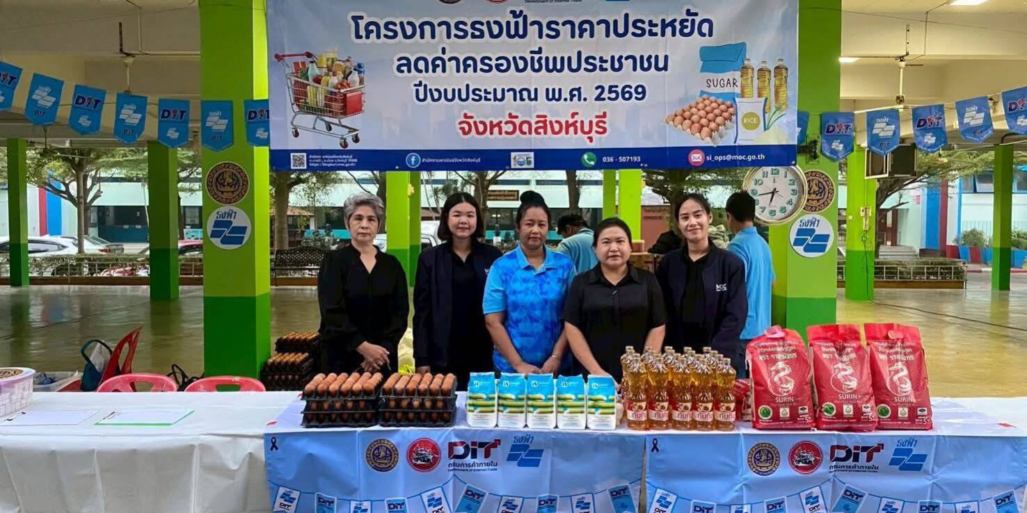 วันศุกร์ที่ 16 มกราคม 2569 สำนักงานพาณิชย์จังหวัดสิงห์บุรี จัดงานธงฟ้าราคาประหยัดลดค่าครองชีพประชาชน จังหวัดสิงห์บุรี ร่วมกับงานวันครู พ.ศ.2569 ณ โรงเรียนสิงห์บุรี อำเภอเมืองสิงห์บุรี จังหวัดสิงห์บุรี โดยนำสินค้าอุปโภคบริโภคที่จำเป็นแก่การครองชีพในจำหน่ายในราคาต่ำกว่าท้องตลาด อาทิ ข้าวสารบรรจุถุง น้ำมันพืช ไข่ไก่ น้ำตาลทราย เป็นต้น เพื่อบรรเทาความเดือดร้อนและลดภาระค่าครองชีพของประชาชน ซึ่งมีประชาชนให้ความสนใจเลือกซื้อสินค้าอุปโภคบริโภคที่จำเป็นต่อการครองชีพเป็นจำนวนมาก มีมูลค่าการจำหน่ายทั้งสิ้น 47,900 บาท สามารถลดค่าครองชีพประชาชนได้ 22,110 บาท คิดเป็นร้อยละ 31.59
