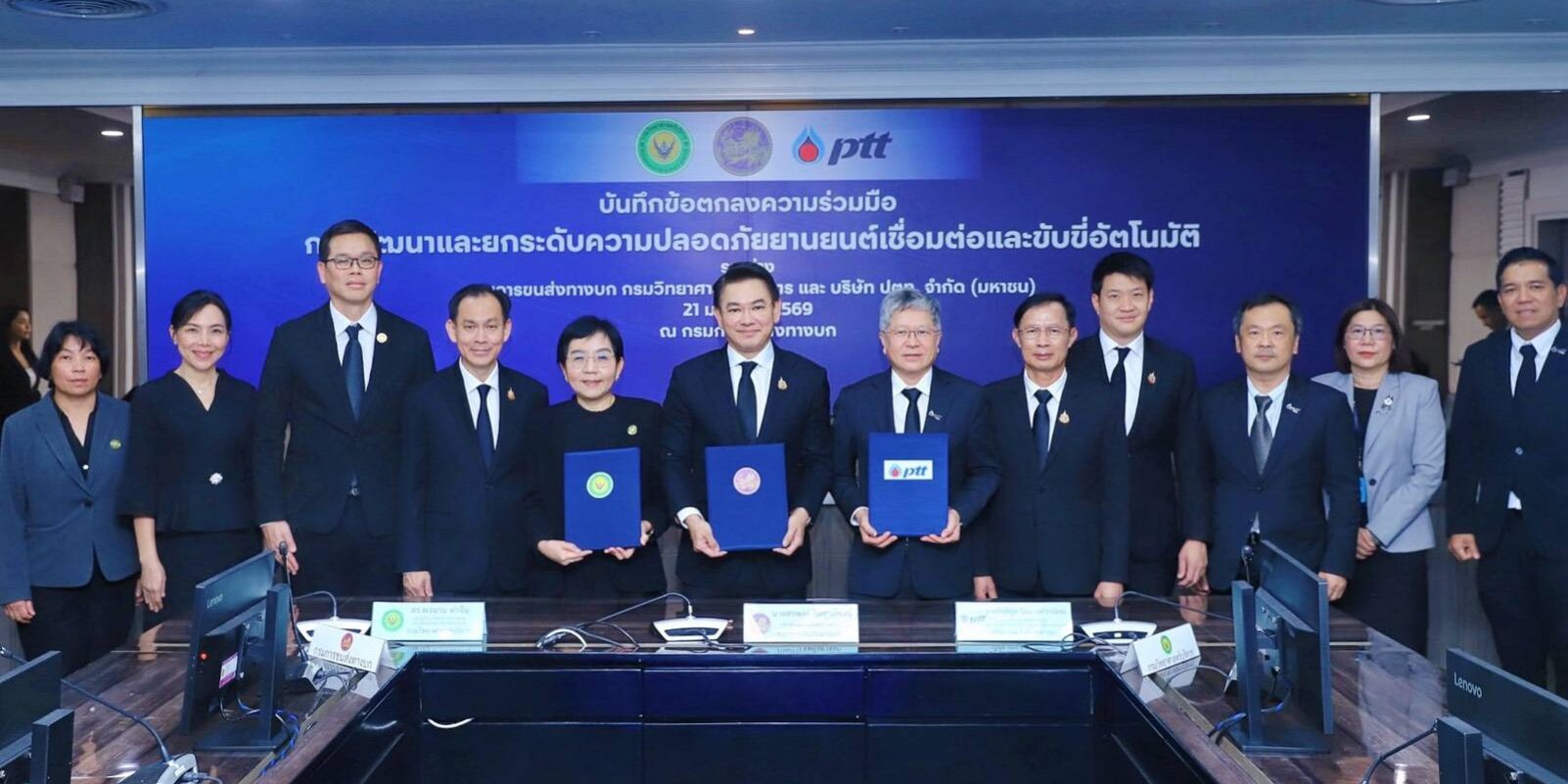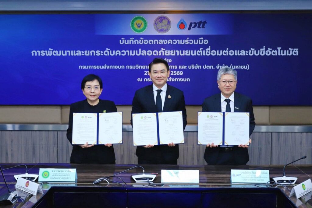 วันที่ 21 มกราคม 2569 กรมวิทยาศาสตร์บริการ (วศ.) กระทรวงการอุดมศึกษา วิทยาศาสตร์ วิจัยและนวัตกรรม (อว.) โดย ดร.พจมาน ท่าจีน รองอธิบดี รักษาราชการแทนอธิบดีกรมวิทยาศาสตร์บริการ ร่วมพิธีลงนามบันทึกข้อตกลงความร่วมมือ (MOU) ว่าด้วยการพัฒนาและยกระดับความปลอดภัยยานยนต์เชื่อมต่อและขับขี่อัตโนมัติ (Connected and Autonomous Vehicle: CAV) โดยมีนายสรพงศ์ ไพฑูรย์พงษ์ อธิบดีกรมการขนส่งทางบก นายรัตติกูล ปิยะวงค์วาณิชย์ รองกรรมการผู้จัดการใหญ่วิศวกรรมโครงการและการปฏิบัติการสู่ความ เป็นเลิศ บริษัท ปตท. จำกัด (มหาชน) พร้อมด้วยคณะผู้บริหารทั้ง 3 หน่วยงาน ร่วมลงนาม วัตถุประสงค์เพื่อร่วมกันขับเคลื่อนการพัฒนาและยกระดับความปลอดภัยในการใช้งาน CAV อย่างครบวงจร ตั้งแต่การศึกษาวิจัย การพัฒนา การทดสอบ การอนุญาตใช้งาน ไปจนถึงการสร้างความเชื่อมั่นแก่ประชาชน โดยมุ่งสนับสนุนการจัดทำมาตรฐาน ข้อกำหนด และกฎหมายที่เกี่ยวข้องให้สอดคล้องกับมาตรฐานสากล ควบคู่กับการพัฒนาและเสริมสร้างศักยภาพบุคลากร เพื่อรองรับการนำเทคโนโลยียานยนต์สมัยใหม่มาใช้อย่างปลอดภัย และเหมาะสมกับบริบทของประเทศไทย ณ ห้องประชุม 1 ชั้น 3 อาคาร 1 กรมการขนส่งทางบก