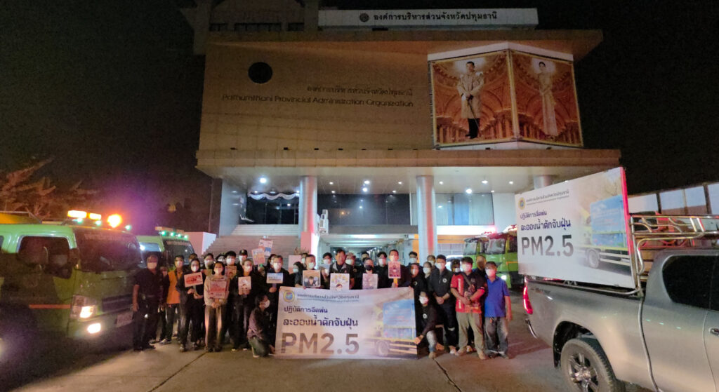 โดย พลตำรวจโท คำรณวิทย์ นายก อบจ.ปทุมธานี เปิดเผยว่า ในช่วงสัปดาห์ที่ผ่านมา โดยเฉพาะ 3 วันล่าสุด สถานการณ์ฝุ่น PM 2.5 ในจังหวัดปทุมธานีอยู่ในขั้นวิกฤต จากการตรวจสอบเครื่องวัดค่าฝุ่นพบว่า ดัชนีพุ่งสูงกว่า 70 ไมโครกรัมต่อลูกบาศก์เมตร ในหลายพื้นที่ ซึ่งแสดงผลเป็น “สีแดง” (ระดับที่มีผลกระทบต่อสุขภาพ) ตลอดเวลา โดยเฉพาะช่วงเช้า ทัศนวิสัยในจังหวัดเหมือนเมืองในหมอก แต่มันไม่ใช่หมอกจริง มันคือฝุ่นที่เป็นอันตรายมาก ทาง อบจ.ปทุมธานีจึงมี มาตรการเร่งด่วน เพื่อบรรเทาความเดือดร้อนของประชาชน โดยได้สั่งการให้กองป้องกันและบรรเทาสาธารณภัย ดำเนินการ ระดมรถฉีดพ่นละอองน้ำทำการฉีดพ่นละอองฝอยในอากาศเพื่อดักจับฝุ่นทุกวัน และต้องล้างทำความสะอาดถนน เพื่อลดการฟุ้งกระจายของฝุ่นที่สะสมบนพื้นผิวจราจร ซึ่งทาง อบจ.ปทุมธานี จะติดตามผลต่อเนื่อง และจะมีการวัดค่าฝุ่นและออกปฏิบัติการทุกวันจนกว่าสถานการณ์จะกลับเข้าสู่ภาวะปกติ