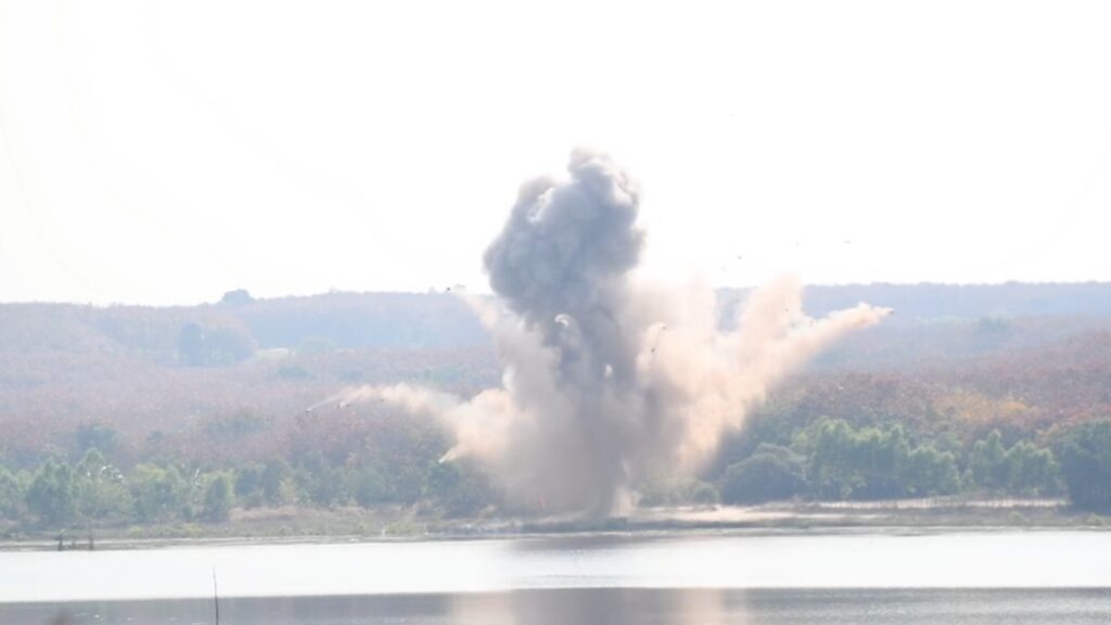 วันที่ 21 ม.ค. 2569 พลโท วีระยุทธ รักศิลป์ แม่ทัพภาคที่ 2 ได้เดินทางมาร่วมสังเกตการณ์การทำลายลูกปืน ค. และลูกจรวดหลายลำกล้อง BM 21 ที่บริเวณด้านล่างอ่างเก็บน้ำห้วยตาเขียว (ทิศเหนือสันอ่าง) ต.บึงเจริญ อ.บ้านกรวด จ.บุรีรัมย์ ซึ่งเป็นพื้นที่ปลอดภัยอยู่ห่างไกลจากแหล่งชุมชนและพื้นที่ทางการเกษตร โดยมีระเบิดที่ยังไม่ระเบิดและต้องทำลายจำนวน 7 ลูก จากทั้งหมดที่ทหารกัมพูชายิงเข้ามาในเขตพื้นที่พลเรือนของฝั่งไทย 169 ลูก และยังอยู่ระหว่างการสำรวจอีกอย่างต่อเนื่องในเขตพื้นที่สีแดง โดยเฉพาะในแหล่งน้ำสาธารณะ ซึ่งการทำลายระเบิดเป็นไปด้วยดี ซึ่งฝ่ายไทยได้ประสานแจ้งไปยังฝั่งกัมพูชา แล้วว่าจะมีการทำลายระเบิด