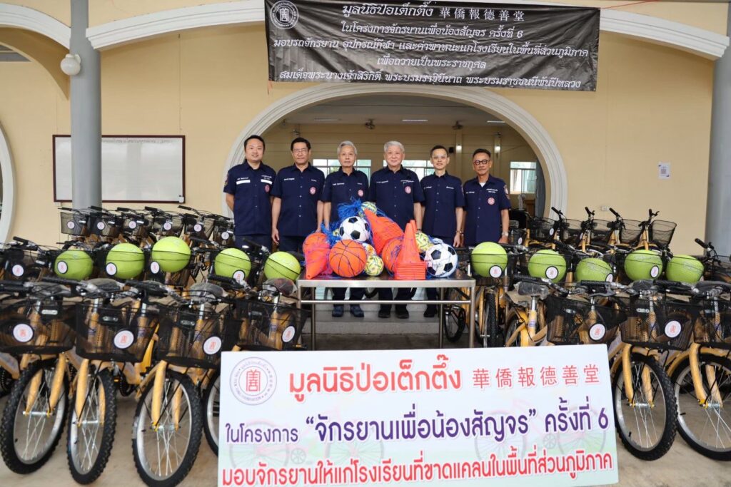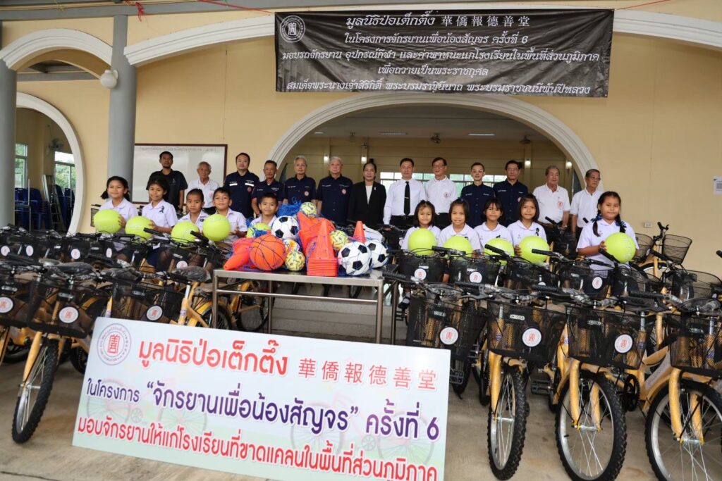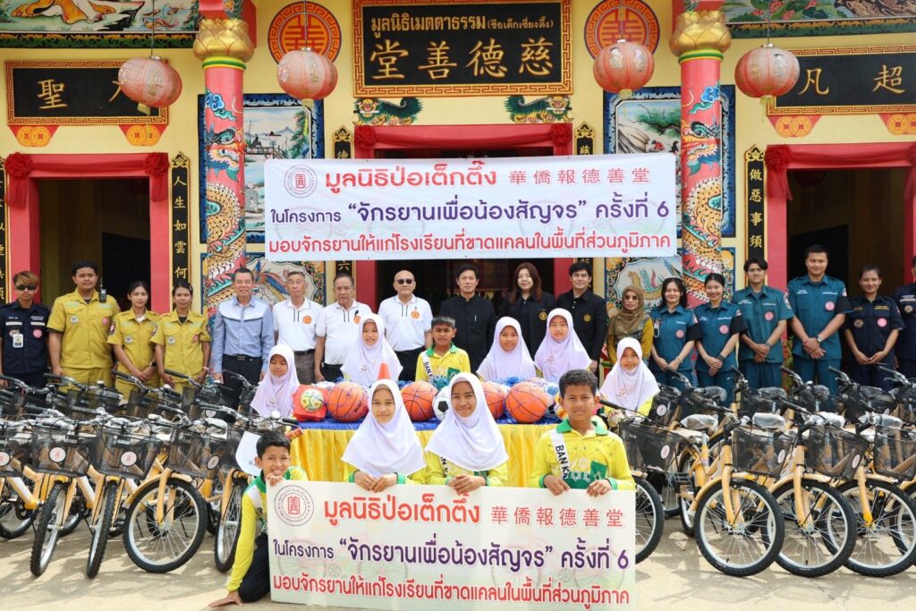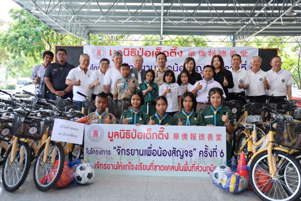 ระหว่างวันที่ 11 พฤศจิกายน 2568 – 22 มกราคม 2569 มูลนิธิป่อเต็กตึ๊ง โดย นายวิเชียร เตชะไพบูลย์ ห่วงใยนักเรียนในพื้นที่ชนบทภาคกลางและภาคใต้ มอบหมายให้ คณะกรรมการ และผู้ช่วยกรรมการมูลนิธิฯ นำโดย นายจารุรัตน์ คุณัตถานนท์ กรรมการและเหรัญญิก นายสุรพงศ์ เสรฐภักดี กรรมการและรองเหรัญญิก นายชาญกิจ วิทยาวรากรณ์ กรรมการ นายชูเดช เตชะไพบูลย์ ผู้ช่วยกรรมการ นำทีมฝ่ายสาธารณภัย และฝ่ายสังคมสงเคราะห์ ลงพื้นที่ภาคกลางและภาคใต้ มอบรถจักรยานพร้อมอุปกรณ์กีฬาและค่าพาหนะให้แก่โรงเรียนชนบทที่ขาดแคลนภาคกลางและภาคใต้ ในโครงการ “จักรยานเพื่อน้องสัญจร” ครั้งที่ 6 รวม 20 จังหวัด 100 โรงเรียน ประกอบด้วย จังหวัดพระนครศรีอยุธยา ลพบุรี ชัยนาท สุพรรณบุรี กาญจนบุรี สมุทรสงคราม ชลบุรี จันทบุรี ตราด สระแก้ว ชุมพร สุราษฎร์ธานี นครศรีธรรมราช พัทลุง ตรัง สตูล สงขลา ปัตตานี ยะลา และนราธิวาส รวมจำนวนจักรยาน 2,000 คัน อุปกรณ์กีฬา จำนวน 100 ชุด และค่าพาหนะแก่โรงเรียนๆ ละ 2,000 บาท รวมงบประมาณดำเนินการทั้งสิ้น 2,854,000 บาท (สองล้านแปดแสนห้าหมื่นสี่พันบาทถ้วน) เพื่ออำนวยความสะดวกแก่นักเรียนที่ประสบปัญหาในการเดินทางมาโรงเรียน รวมถึงเป็นการแบ่งเบาภาระค่าพาหนะแก่ผู้ปกครองได้อีกทางหนึ่ง อีกทั้งยังเสริมสร้างให้นักเรียนได้ออกกำลังกาย เรียนรู้กฎจราจร เรียนรู้การแบ่งปัน และดูแลรักษาสาธารณสมบัติร่วมกัน โดยมี ผู้แทนจากหน่วยงานรัฐเป็นประธานในพิธี พร้อมด้วยเยาวชนและผู้แทนจากสถาบันการศึกษา เป็นตัวแทนรับมอบ และสมาคม/มูลนิธิแต่ละจังหวัด เป็นผู้ประสานงานและร่วมในพิธี รวมถึง อาสาสมัครเฉพาะกิจ และอาสาศิลปินมูลนิธิป่อเต็กตึ๊ง นำโดย นายนเรศ วิทยาวรากรณ์ นายวิวัฒน์ แก้วกำพลกุล และนายวาทิต อิทธิฤทธิ์โสภา (วินน์) ร่วมลงพื้นที่มอบ