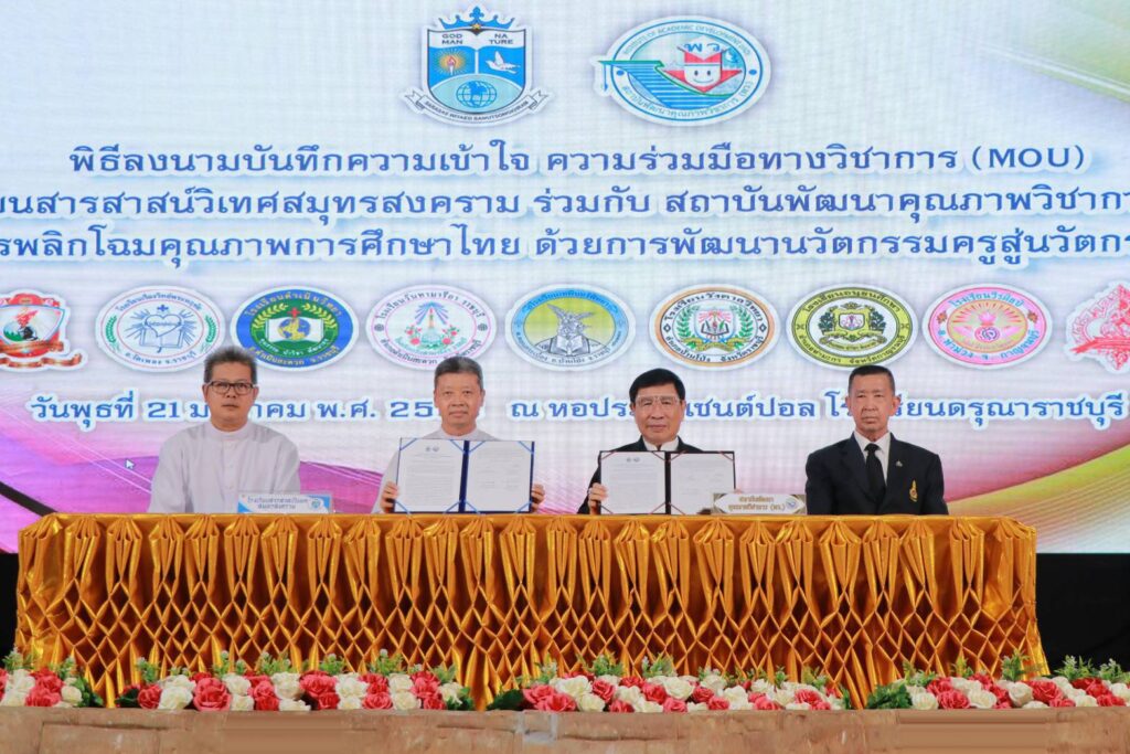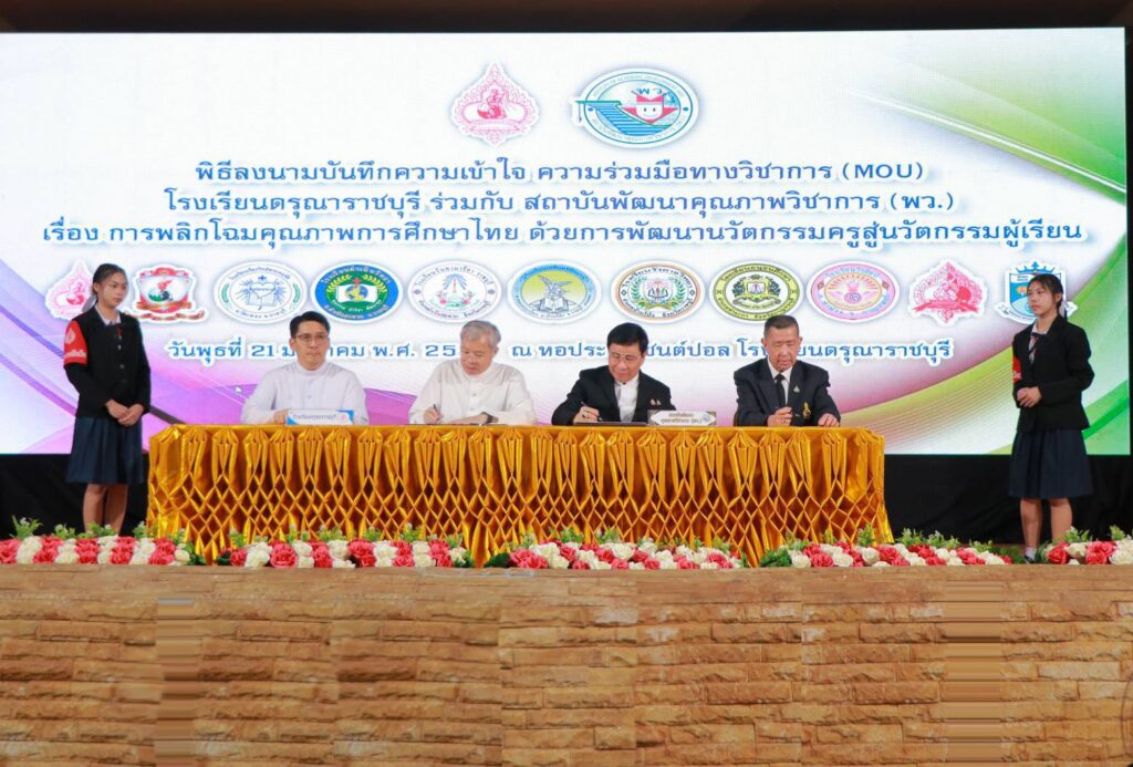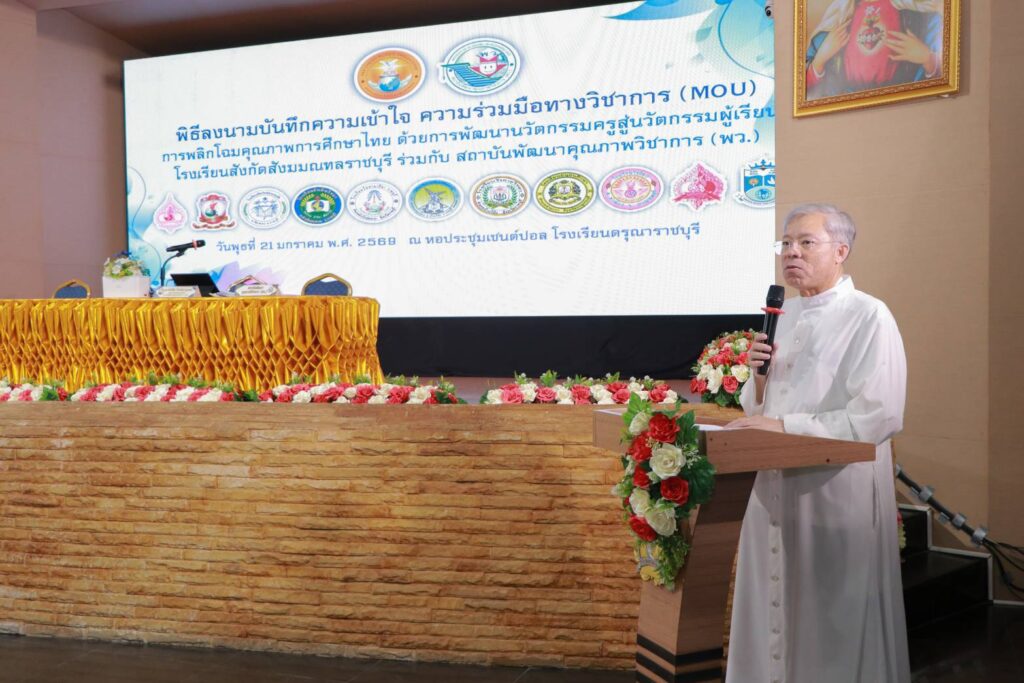 เมื่อวันที่ 21 มกราคม พ.ศ.2569 ณ หอประชุมเซนต์ปอล โรงเรียนดรุณาราชบุรี จังหวัดราชบุรี ได้มีพิธีลงนามบันทึกความเข้าใจ (MOU) เรื่องการพลิกโฉมคุณภาพการศึกษาไทย ด้วยการพัฒนานวัตกรรมครูสู่นวัตกรรมผู้เรียน โดยเป็นโครงการความร่วมมือทางวิชาการระหว่าง โรงเรียนในสังกัดสังฆมณฑลราชบุรี ซึ่งในวันนี้มีโรงเรียนในจังหวัดราชบุรี กาญจนบุรี และจังหวัดสมุทรสงคราม จำนวน 12 โรงเรียน ร่วมลงนามกับ สถาบันพัฒนาคุณภาพวิชาการ (พว.) โดยมี ดร.ศักดิ์สิน โรจน์สราญรมย์ ประธานกรรมการบริหารสถาบันพัฒนาคุณภาพวิชาการ (พว.) นายไพศาล โรจน์สราญรมย์ รองประธานกรรมการบริหาร พว. บาทหลวง ผศ.ดร.อภิสิทธิ์ กฤษเจริญ ผู้อำนวยการฝ่ายอบรมศึกษาสังฆมณฑลราชบุรี บาทหลวง ดร.สมเกียรติ จูรอด ผู้อำนวยการศูนย์วิชาการโรงเรียนในสังกัดสังฆมณฑลราชบุรี ตลอดจนผู้อำนวยการและผู้บริหารโรงเรียนในสังกัดสังฆมณฑราชบุรี คณะครูผู้รับผิดชอบด้านบริหารงานวิชาการ บุคลากรทางการศึกษา และเจ้าหน้าที่ทุกภาคส่วนที่เกี่ยวข้อง มาร่วมเป็นสักขีพยานโดยพร้อมเพรียงกัน