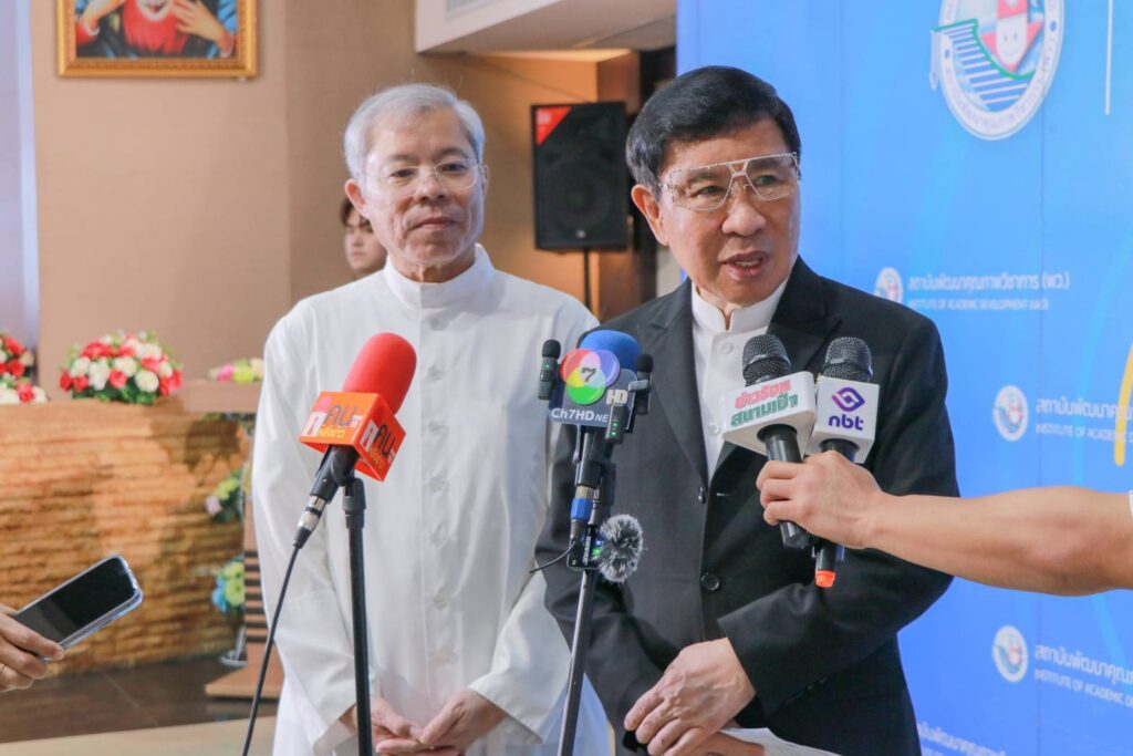 บาทหลวง ผศ.ดร.อภิสิทธิ์ กฤษเจริญ ผู้อำนวยการฝ่ายอบรมศึกษาสังฆมณฑลราชบุรี กล่าวถึงจุดประสงค์และที่มาของการทำบันทึกความเข้าใจ (MOU) ความร่วมมือทางวิชาการครั้งนี้ ว่า เกิดจากแนวคิดร่วมกันของผู้บริหารโรงเรียนในสังกัดสังฆมณฑลราชบุรี ที่เห็นตรงกันว่าการบริหารจัดการศึกษาไทยในยุคปัจจุบันของโรงเรียนเอกชน เต็มไปด้วยความท้าทายและความเสี่ยง ทั้งด้านจำนวนนักเรียนที่ลดลง ด้านความผันผวนทางเศรษฐกิจ รวมถึงพิษภัยของสื่อโซเชียล และที่สำคัญ คือ การพัฒนาสมรรถนะและกระบวนทัศน์การจัดการเรียนรู้ให้กับผู้เรียนยุคปัจจุบัน ซึ่งที่ผ่านมาหลายโรงเรียนได้ขยับปรับเปลี่ยนตนเองแล้ว รวมถึงโรงเรียนดรุณาราชบุรี ที่ถูกยกให้เป็นต้นแบบของการจัดการเรียนรู้แบบ Active Learning ในยุค Ai ดังนั้น หากโรงเรียนในสังกัดสังฆมณฑลราชบุรี ซึ่งมีสถานศึกษาในการกำกับดูแลทั้งหมด 17 แห่ง ได้ผนึกกำลังเพื่อขับเคลื่อนสถานศึกษาไปด้วยกัน โดยมีสถาบันพัฒนาคุณภาพวิชาการ (พว.) ผ่านทาง ดร.ศักดิ์สิน โรจน์สราญรมย์ ประธานกรรมการบริหารสถาบันพัฒนาคุณภาพวิชาการ และทีมงาน คอยดูแลสนับสนุนอย่างต่อเนื่อง ซึ่งในเบื้องต้นมีโรงเรียนในสังกัดสังฆมณฑลราชบุรี จำนวน 12 แห่ง ได้มาลงนามความร่วมมือทางวิชาการร่วมกับสถาบันพัฒนาคุณภาพวิชาการ (พว.) ในวันนี้ ได้แก่ โรงเรียนดรุณาราชบุรี โรงเรียนดรุณาราชบุรีวิเทศศึกษา โรงเรียนเรืองวิทย์พระหฤทัย โรงเรียนดำเนินวิทยา โรงเรียนวันทามารีอาราชบุรี โรงเรียนเทพินทร์พิทยา โรงเรียนวังตาลวิทยา โรงเรียนเทพวิทยา โรงเรียนอนุชนศึกษา โรงเรียนวีรศิลป์ โรงเรียนดรุณากาญจนบุรี และ โรงเรียนสารสาสน์วิเทศสมุทรสงคราม