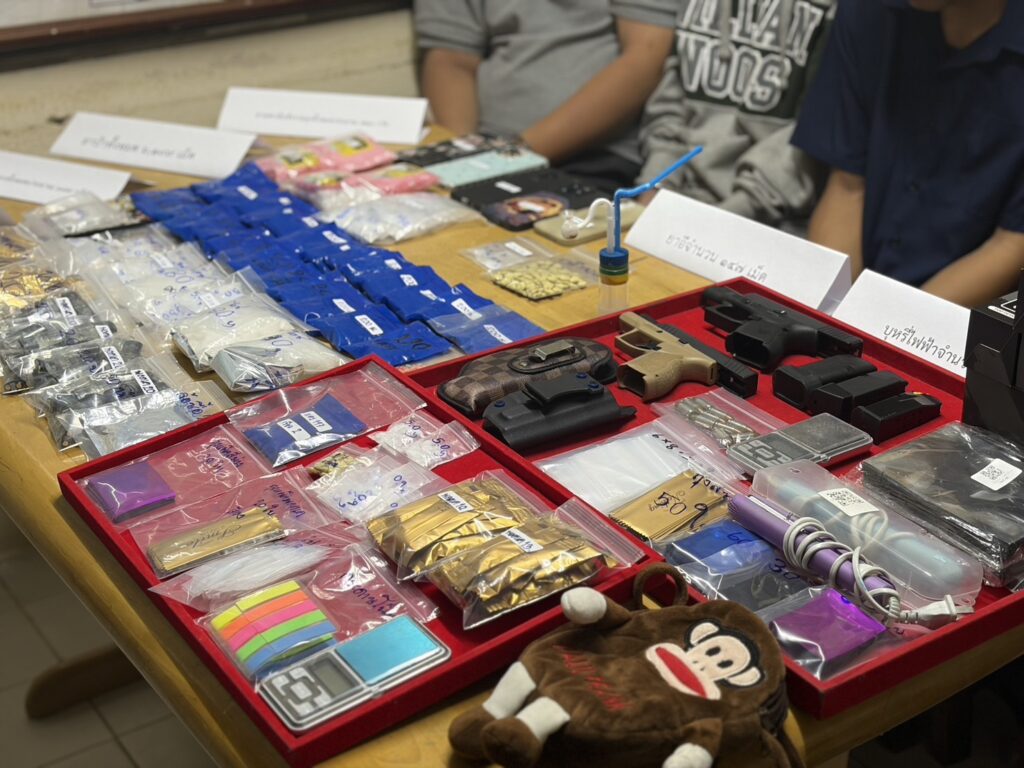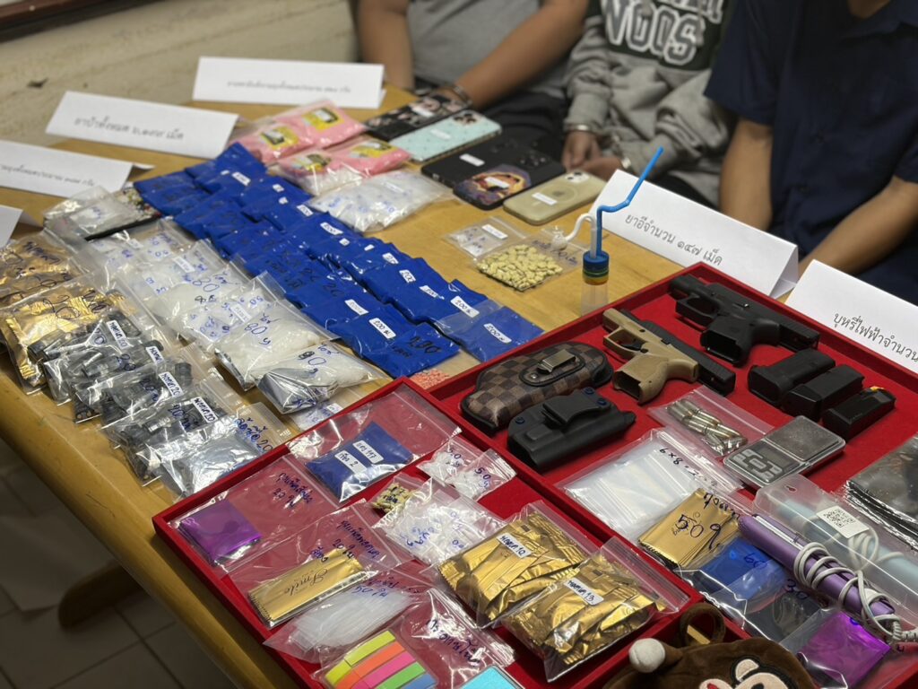ในการทลายเครือข่ายค้ายาเสพติดแก๊งนี้ ยังค้นพบอาวุธปืนแบบกึ่งอัตโนมัติ ยี่ห้อกล๊อก รุ่นกล๊อก 26 เจน 4 สีดำ ขนาด 9 มม. ระบุหมายเลขทะเบียนปืน กท 60302932 จำนวน 1 กระบอก พร้อมซองกระสุนจำนวน 2 อัน , อาวุธปืนแบบกึ่งอัตโนมัติ ยี่ห้อเทารัส รุ่นจีเอ๊กซ์ 4 สีน้ำตาล-ดำ ขนาด 9 มม. ระบุหมายเลขทะเบียนปืน กท 6609163 จำนวน 1 กระบอก พร้อมซองกระสุนจำนวน 1 อัน และเครื่องกระปืน ขนาด 9 มม. จำนวน 10 นัด