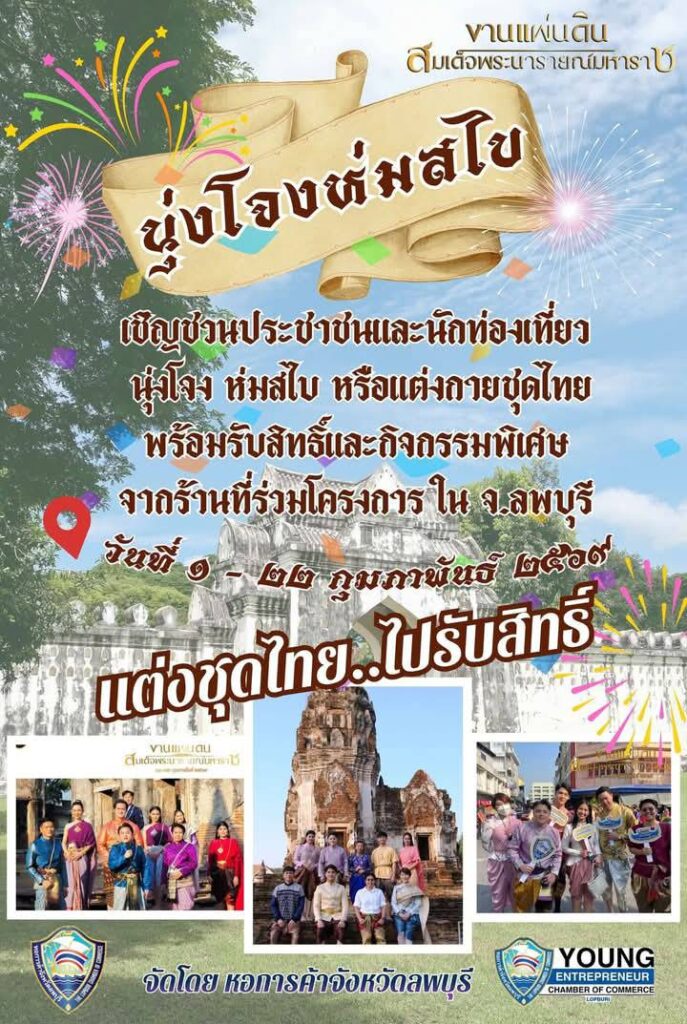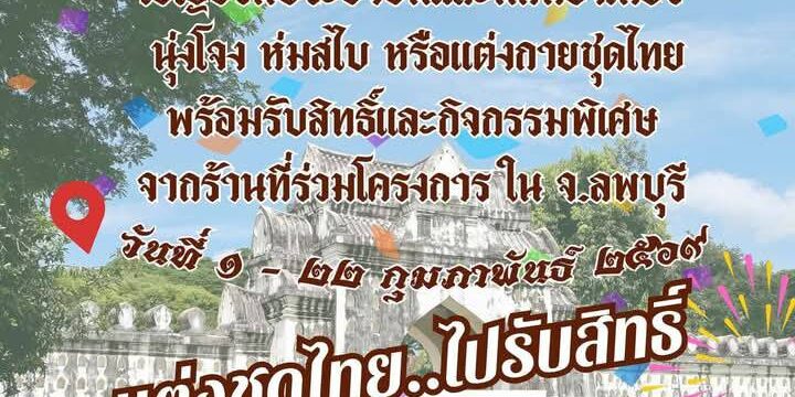 หอการค้าจังหวัดลพบุรี มีกิจกรรมส่งเสริมการท่องเที่ยวจังหวัดลพบุรี ช่วงเดือนกุมภาพันธ์ เป็นฤดูกาลการท่องเที่ยวจังหวัดลพบุรี นุ่งโจงห่มสไบ แต่งชุดไทย…ไปรับสิทธิ์