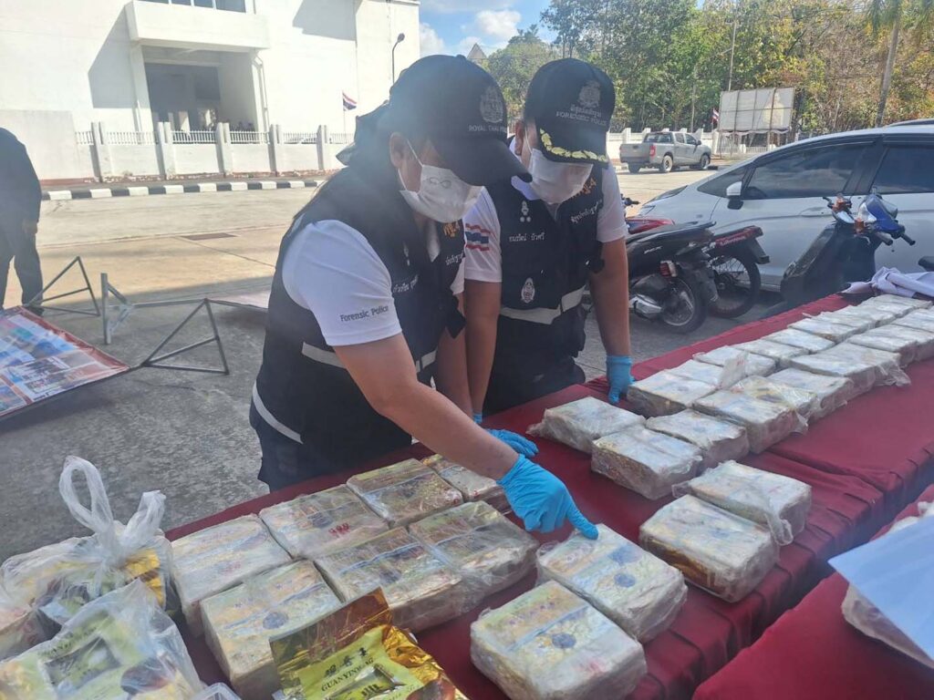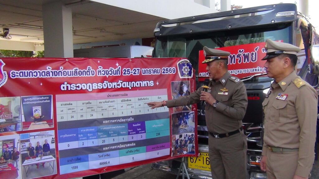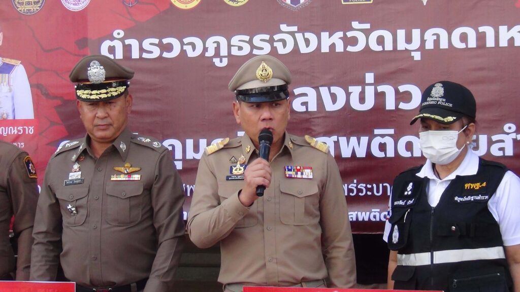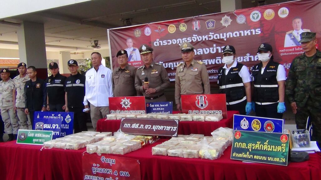 มุกดาหาร -ตำรวจภูธรจังหวัดมุกดาหาร พร้อมด้วยหน่วยความมั่นคงในพื้นที่ แถลงการณ์จับกุมยาเสพติดให้โทษประเภท 1 (ยาไอซ์) รายสำคัญปฏิบัติการสกัดกั้นและปราบปรามยาเสพติด ในพื้นที่ชายแดน จับกุมวัยรุ่น 4 ราย ยาไอซ์ 50 กก. และยึดทรัพย์รถยนต์ 7 คัน รถจักรยานยนต์ 4 คัน มูลค่ากว่า 6 ล้านบาท