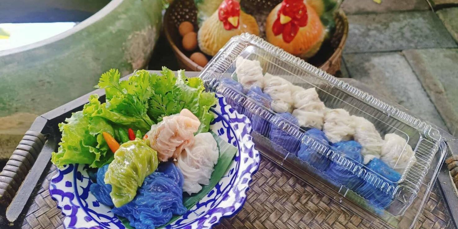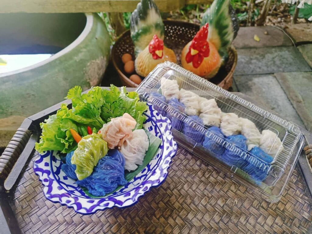 ในส่วนของแป้งข้าวเกรียบปากหม้อ ไม่ใช้สีผสมอาหาร เป็นสีจากธรรมชาติ มีทั้งหมด 3 สี สีขาวจากแป้งขาว สีม่วงจากอัญชัญ และสีเขียวจากใบเตย