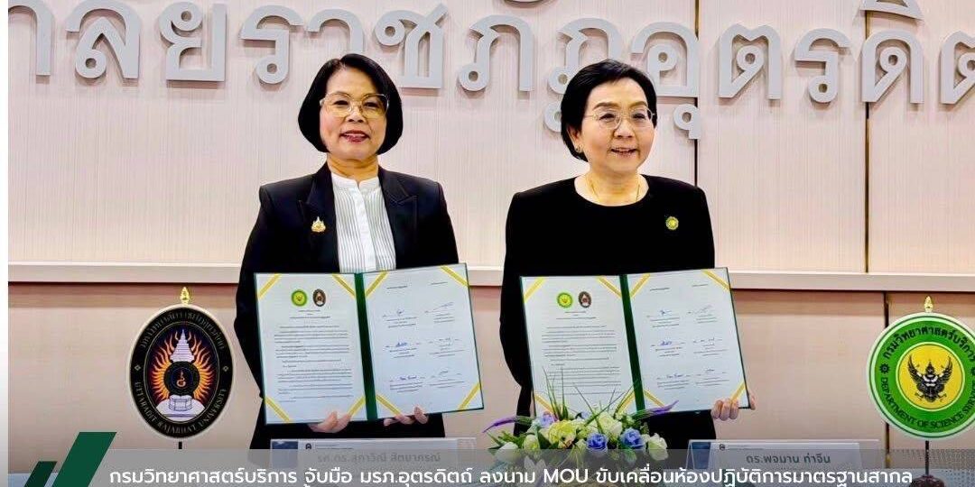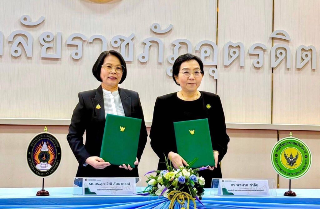 กระทรวงการอุดมศึกษา วิทยาศาสตร์ วิจัยและนวัตกรรม โดยกรมวิทยาศาสตร์บริการ (วศ.) และมหาวิทยาลัยราชภัฏอุตรดิตถ์ (มรภ.อุตรดิตถ์) ร่วมลงนามบันทึกความเข้าใจความร่วมมือ (MOU) เพื่อส่งเสริมและพัฒนาความร่วมมือด้านวิทยาศาสตร์ เทคโนโลยี การวิจัย และการทดสอบ มุ่งยกระดับศักยภาพห้องปฏิบัติการของศูนย์วิทยาศาสตร์และเทคโนโลยี มหาวิทยาลัยราชภัฏอุตรดิตถ์ ให้เข้าสู่ระบบคุณภาพและมาตรฐานสากล ISO/IEC 17025 และเป็นเครือข่ายห้องปฏิบัติการที่ได้รับการยอมรับจากกรมวิทยาศาสตร์บริการ (DSS Recognized Laboratory) เพื่อเสริมสร้างความเข้มแข็งของโครงสร้างพื้นฐานทางคุณภาพของประเทศ (National Quality Infrastructure: NQI) ในระดับภูมิภาค พิธีลงนามจัดขึ้น ณ มหาวิทยาลัยราชภัฏอุตรดิตถ์ โดยมีดร.พจมาน ท่าจีน รองอธิบดี รักษาราชการแทนอธิบดีกรมวิทยาศาสตร์บริการ ลงนามร่วมกับ รองศาสตราจารย์ ดร.สุภาวิณี สัตยาภรณ์ รักษาราชการแทนอธิการบดีมหาวิทยาลัยราชภัฏอุตรดิตถ์ พร้อมด้วยผู้บริหารและผู้แทนจากทั้งสองหน่วยงานร่วมเป็นสักขีพยาน