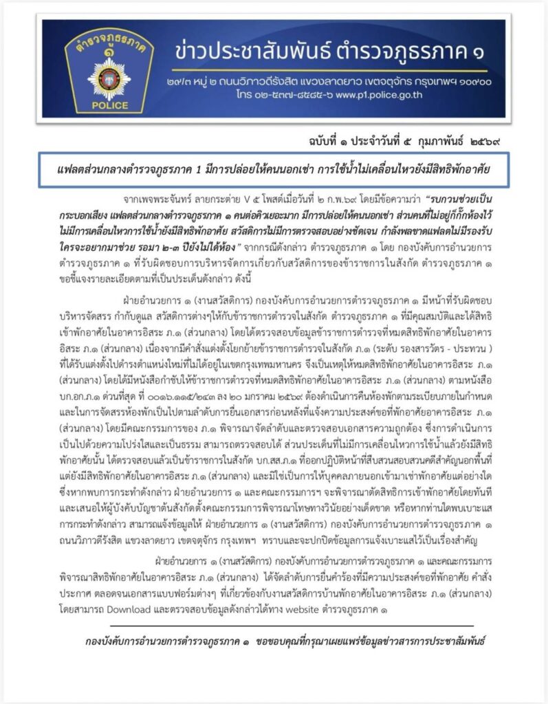 เมื่อวันที่ ๕ กุมภาพันธ์ ๒๕๖๘ ตำรวจภูธรภาค ๑ ออกเอกสารข่าวประชาสัมพันธ์ฉบับที่ ๑ ชี้แจงกรณีมีการเผยแพร่ข้อความร้องเรียนผ่านเพจเฟซบุ๊ก “พระจันทร์ ลายกระต่าย V5” เมื่อวันที่ ๒ กุมภาพันธ์ ๒๕๖๘ ระบุว่า แฟลตส่วนกลางตำรวจภูธรภาค ๑ มีผู้รอคิวจำนวนมาก แต่กลับมีการปล่อยให้บุคคลภายนอกเช่าพักอาศัย ขณะเดียวกันมีข้าราชการบางรายที่ไม่ได้พักอาศัยจริง ไม่มีการใช้น้ำ แต่ยังคงมีสิทธิครอบครองห้องพัก ส่งผลให้เกิดความไม่เป็นธรรมด้านสวัสดิการ และทำให้กำลังพลขาดที่พักอาศัย ต้องรอคิวนานถึง ๒–๓ ปี