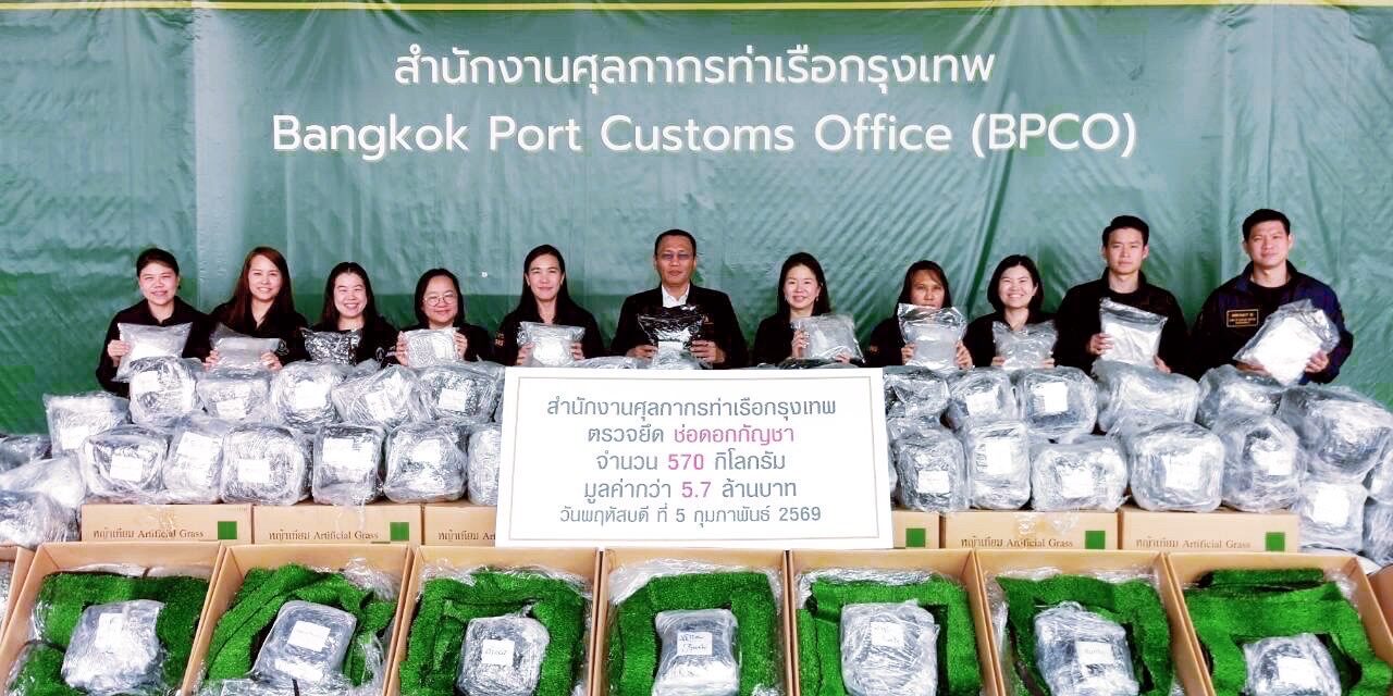 สำนักงานศุลกากรท่าเรือกรุงเทพได้ดำเนินการตามข้อสั่งการอย่างเคร่งครัดและต่อเนื่อง โดยเมื่อวันพุธที่ 4 กุมภาพันธ์ 2569 เจ้าหน้าที่ตรวจพบช่อดอกและเศษใบกัญชาอบแห้ง บรรจุในถุงสุญญากาศ ซุกซ่อนอยู่ภายในหญ้าเทียม เตรียมส่งออกไปยังประเทศเยอรมนี รวมจำนวน 192 ห่อ น้ำหนักรวมสิ่งห่อหุ้มประมาณ 570 กิโลกรัม มูลค่าภายในประเทศกว่า 5.7 ล้านบาท และหากหลุดรอดไปถึงประเทศปลายทางอาจมีมูลค่าสูงถึงประมาณ 7,000 ยูโรต่อกิโลกรัม หรือคิดเป็นเงินไทยราว 150 ล้านบาท