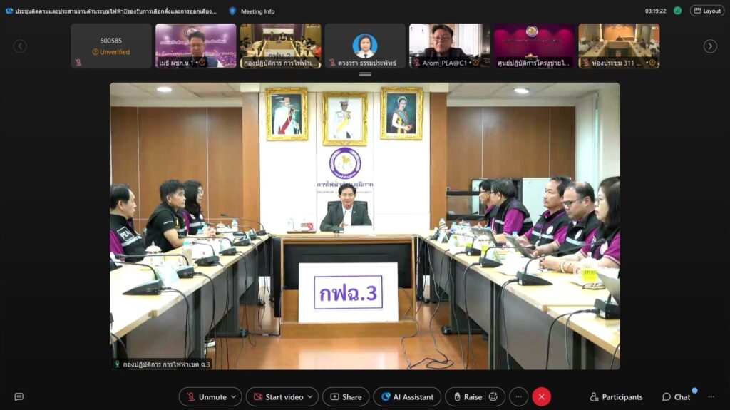 วันที่ 8 กุมภาพันธ์ 2569 ณ ห้องประชุมชั้น 2 (Warroom) อาคารศูนย์ควบคุมการจ่ายไฟ การไฟฟ้าส่วนภูมิภาค เขต 3 (ภาคเหนือ) จังหวัดลพบุรี นายถนัดกิจ น่วมอินทร์ ผู้ช่วยผู้ว่าการ การไฟฟ้าส่วนภูมิภาค เขต 3 (ภาคเหนือ) จังหวัดลพบุรี และนายสณฑ์ประเวศน์ ปั้นงา ผู้อำนวยการฝ่ายปฏิบัติการและบำรุงรักษา พร้อมด้วยผู้บริหาร พนักงานในสังกัดเข้าร่วมประชุมความพร้อมด้านระบบไฟฟ้ารองรับการเลือกตั้ง สมาชิกสภาผู้แทนราษฎร และการออกเสียงประชามติ ปี 2569 โดยมีนายมงคล ตรีกิจจานนท์ ผู้ว่าการการไฟฟ้าส่วนภูมิภาค เป็นประธานในการประชุม