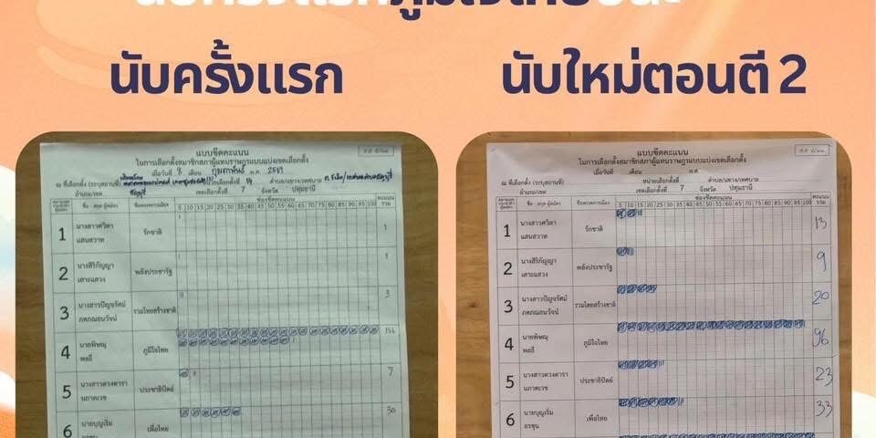 ซึ่งกว่าที่ ผอ. จะมา แล้วก็ประกาศว่าจะได้มีการนับคะแนนเนี่ย ก็ประมาณตี 2 กว่าๆ ได้มีการนับคะแนนจริงๆ ประมาณตี 3 สี่สิบ (03:40 น.) เนื่องจากว่า จะต้องมีการหาอาสาสมัครหน้างานกันแบบด่วนๆ เลย นี่น่าจะเป็นประวัติศาสตร์ที่สำคัญมากๆ ที่ได้มีการร้องแย้งใหม่ และการนับคะแนนที่เกิดจากประชาชนจริงๆ นะคะ เสร็จแล้ว เราก็ต้องมีการแบ่งการนับคะแนนออกเป็น 2 รอบด้วยกัน รอบแรกเนี่ย เราจะนับในหน่วยที่ 1 ถึง 4 ซึ่งต้องย้ำว่านี่คือการนับคะแนนเฉพาะหน่วยที่เลือกตั้งล่วงหน้า เลือกตั้งนอกราชอาณาจักร และนอกเขตเท่านั้น โดย”การนับกันไปก็ต้องมีการขาน ขานรับ แล้วก็ต้องมีการยอมรับจากพยานที่อยู่ในพื้นที่ด้วย ซึ่งกระบวนการทั้งหมด ก็ประมาณตี 3 สี่สิบ นะคะ โดยประมาณ จนถึงประมาณ 8 โมงกว่าๆ คือตัวคะแนนเนี่ย มันไม่ได้พลิกโผไปจากเดิมมากมาย มันอาจจะมีตัวคะแนนที่มันสะท้อนออกมา ส่วนเรื่อง ผลคะแนนที่มีการแชร์เปรียบเทียบกันนั้น ขอให้ประชาชนหยุดการแชร์เพราะมันไม่ใช่เรื่องจริง