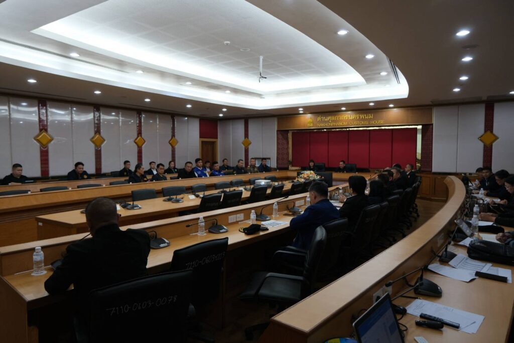 โดยมีนางชนัยพร พูนน้อย นายด่านศุลกากรนครพนมนายอังกูร อังคะเจริญ ผู้อำนวยการส่วนควบคุมทางศุลกากร นายเฉลิมพล คุณประทุม หัวหน้าฝ่ายควบคุมและตรวจสอบ พร้อมด้วยพันตำรวจเอก ชัชชัย สำเนียง ผู้กำกับการตรวจคนเข้าเมืองจังหวัดนครพนมให้การต้อนรับและบรรยายสรุปผลการดำเนินงานเกี่ยวกับการนำเข้าสินค้าและส่งออกสินค้าที่ผิดกฎหมายซึ่งพบว่ายังไม่มีสินค้าที่กระทบความมั่นคงโดยรับทราบสังเกตของสินค้าที่มีมูลค่าการส่งออกสูงสุด ของปีงบประมาณ 2569 ตั้งแต่ตุลาคม 2568 ถึงมกราคม 2569 อันดับ 1 ผลไม้สด 8,546 ล้านบาทคิดเป็นร้อยละ 44 อันดับ 2 เครื่องดื่มบำรุงกำลัง 3,527 ล้านบาทคิดเป็นร้อยละ 18 อันดับ 3 โคกระบือ 3,024 ล้านบาทคิดเป็น ร้อยละ 15 และอันดับ 4 ผลิตภัณฑ์ปิโตรเลียม 1,105 ล้านบาท คิดเป็นร้อยละ 5 ซึ่งถือว่าเป็นยอดการส่งออกที่ดีในปี 2569 ถ้านับเฉพาะไตรมาสแรก ทั้งนี้ นายด่านฯยังให้ข้อมูลเพิ่มเติมว่าบรรดารถบรรทุกสินค้าทั้งส่งออกและนำเข้าจะมีการสุ่มตรวจสิ่งผิดกฎหมายด้วยเครื่องเอกซเรย์ของกรมศุลกากรตามระบบและมาตรฐานในการตรวจสินค้าของกรมศุลกากรด้วย