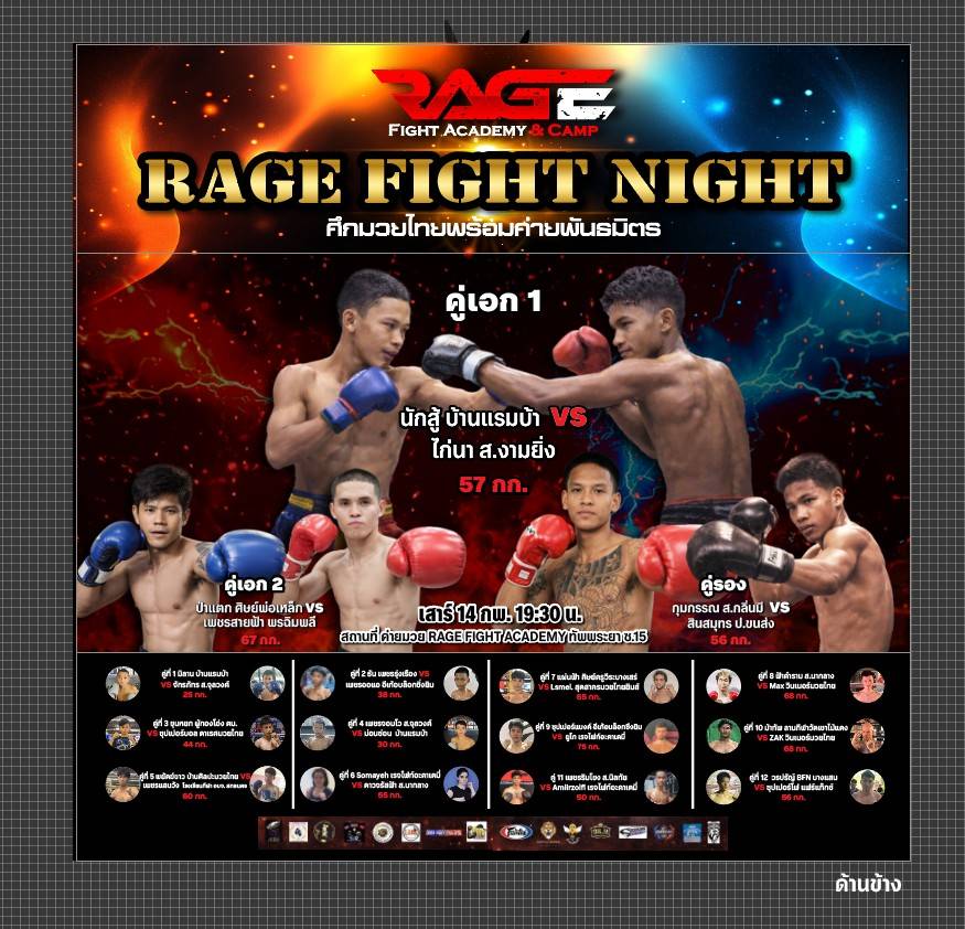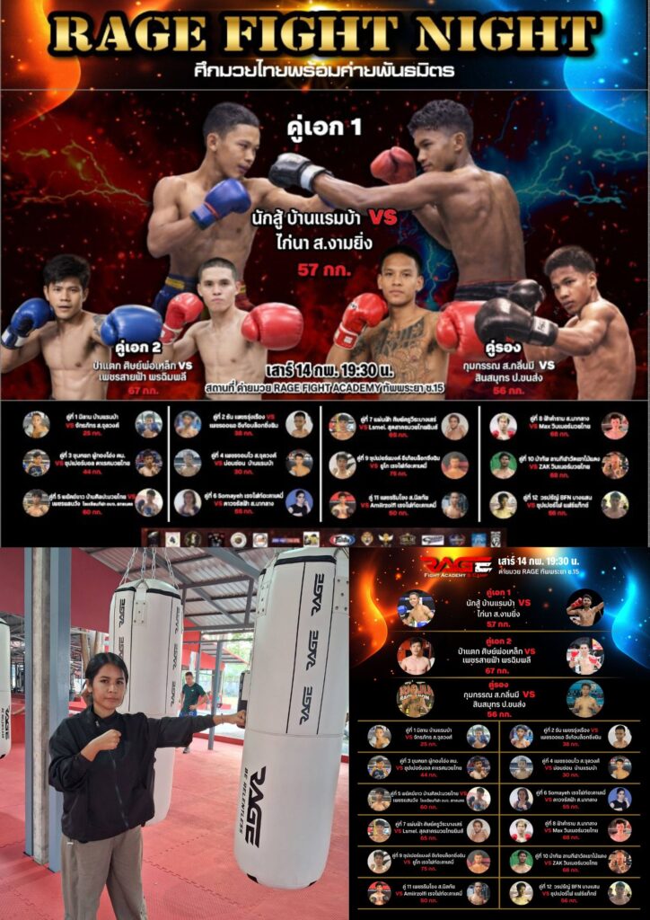 เมื่อวันที่ 14 กุมภาพันธ์ 2569 ผู้สื่อข่าวเดินทางไปยัง ค่ายฝึกสอนมวยไทยชื่อ “RAGE FIGHT ACADEMY & CAMP” ตั้งอยู่ภายในซอยทัพพระยา 15 ถนนสายทัพพระยา-จอมเทียน ต.หนองปรือ อ.บางละมุง จ.ชลบุรี ซึ่งเป็นสถานที่สำหรับใช้เป็นสนามแข่งขันกีฬาชกมวยไทย ไฟต์พิเศษ ภายใต้ชื่อ “ศึกมวยไทยพร้อมค่ายพันธมิตร" RAGE FIGHT NIGHT โดยทางเจ้าหน้าที่ฝ่ายสนาม ได้จัดตั้งเวทีมวยชั่วคราวขนาดมาตรฐาน บนอาณาบริเวณเนื้อที่ขนาด 9 ไร่ เสร็จเป็นที่เรียบร้อย เตรียมพร้อมที่จะระเบิดกำปั้นบนเวทีผืนผ้าใบในช่วงเวลา 18.30 น.ของวันเดียวกัน (14 กุมภาพันธ์ 69)