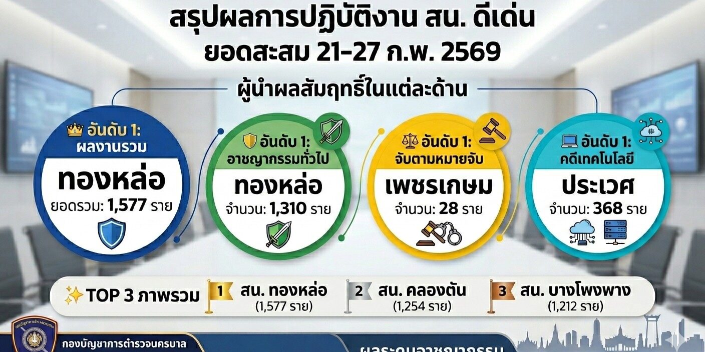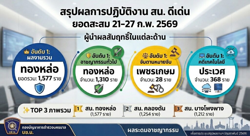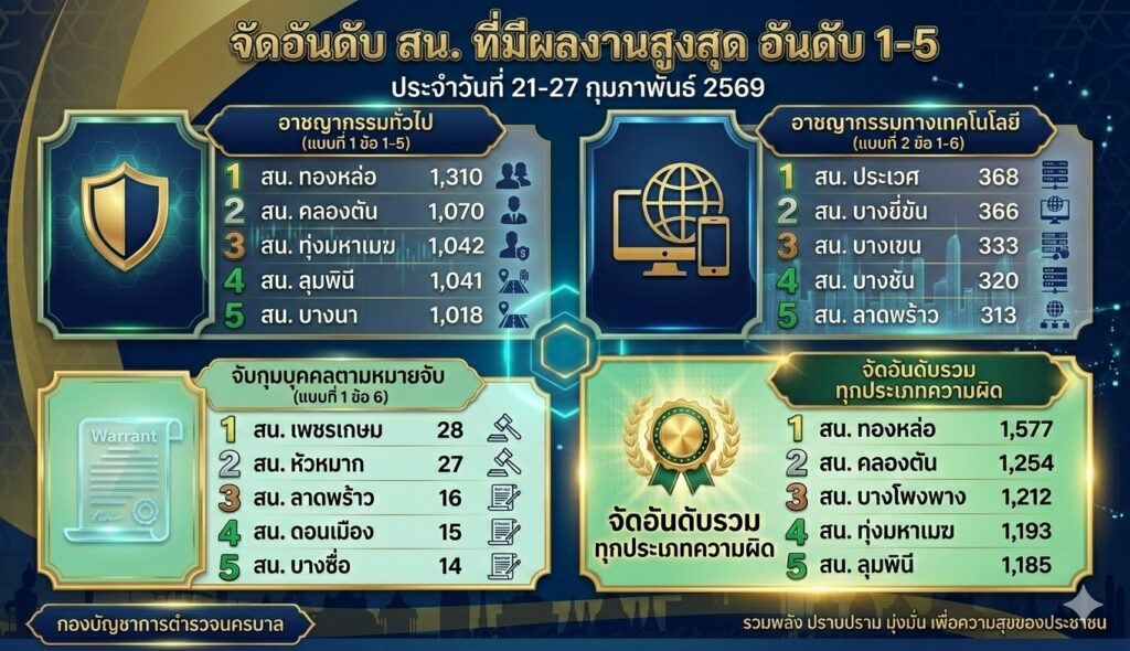 อันดับ 1 ผลการปฏิบัติงานรวมทุกประเภท: สน.ทองหล่อ (1,577 ราย) ตามมาด้วย สน.คลองตัน และ สน.บางโพงพาง