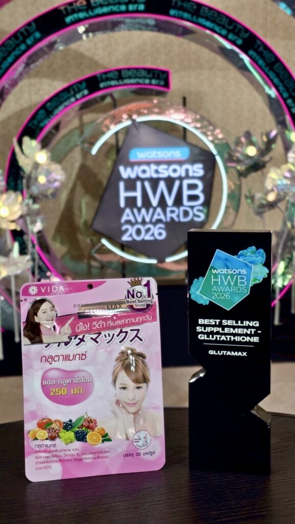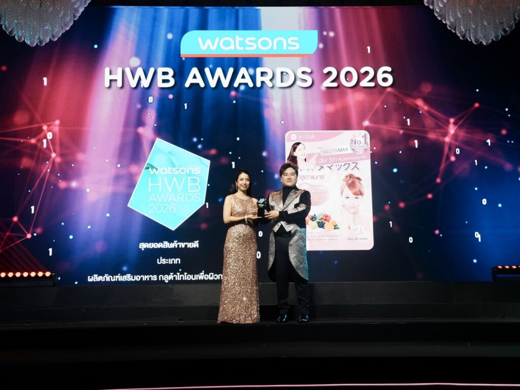 แบรนด์ Vida (วีด้า) สร้างความสำเร็จอย่างต่อเนื่อง ด้วยการคว้ารางวัล Best Selling Food Supplement – Glutathione สุดยอดสินค้าขายดีประเภทผลิตภัณฑ์เสริมอาหารกลูต้าไทโอนเพื่อผิวกระจ่างใส บนเวที Watsons Health Wellness and Beauty Awards 2026 (HWB Awards 2026) ซึ่งถือเป็นหนึ่งในเวทีประกาศรางวัลด้านสุขภาพและความงามที่ได้รับการยอมรับมากที่สุดในประเทศไทย
