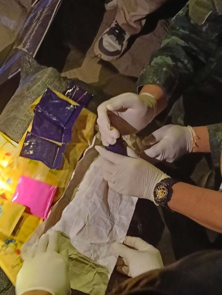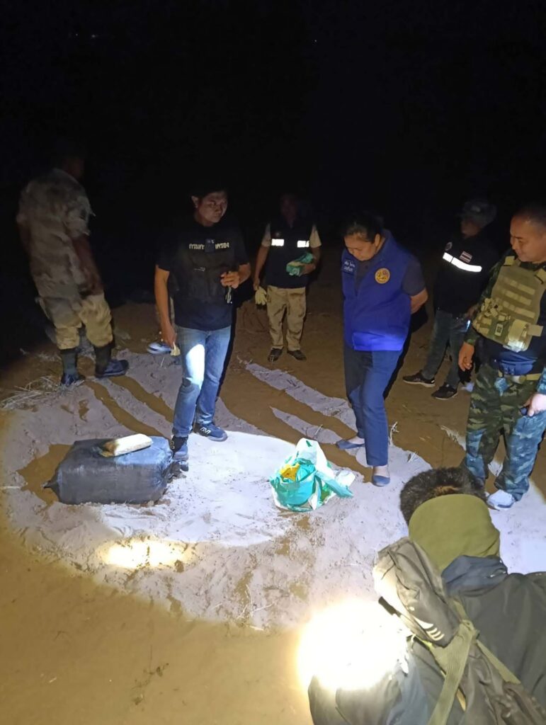 จากการตรวจสอบพื้นที่ พบกระสอบสีดำจำนวน 3 กระสอบ ภายในบรรจุ ยาเสพติดให้โทษประเภทที่ 1 (ยาบ้า) ประมาณกระสอบละ 200,000 เม็ด รวมจำนวนประมาณ 600,000 เม็ด และพบ Happy Water บรรจุในถุงพลาสติกสีขาว จำนวน 100 ซอง เจ้าหน้าที่จึงได้ตรวจยึดไว้เป็นของกลาง พร้อมบันทึกภาพสถานที่เกิดเหตุไว้เป็นหลักฐาน