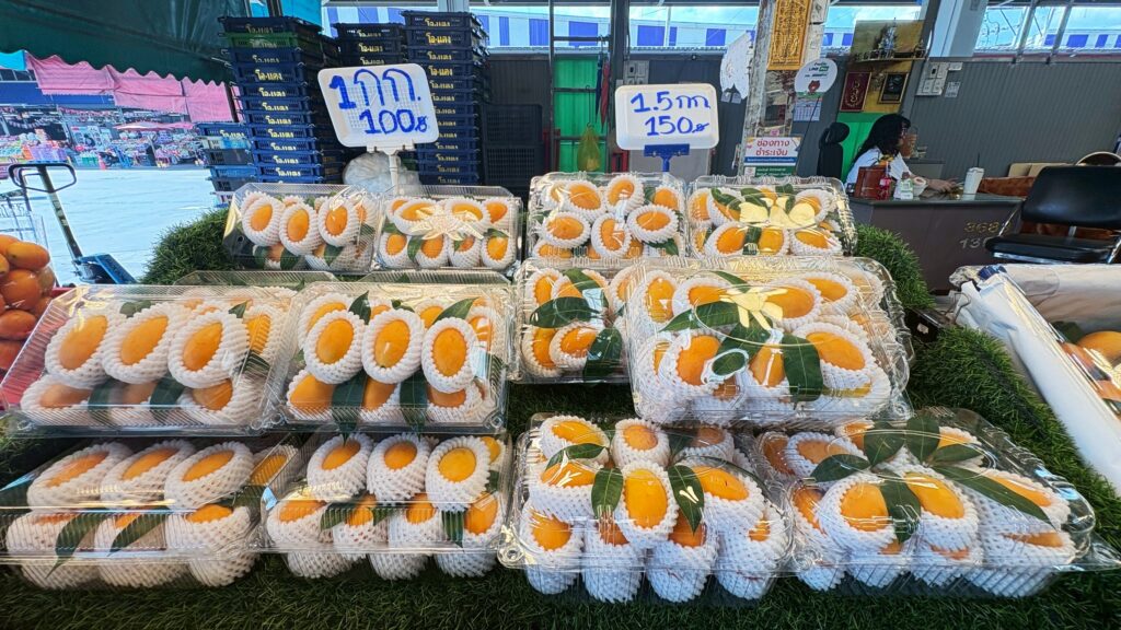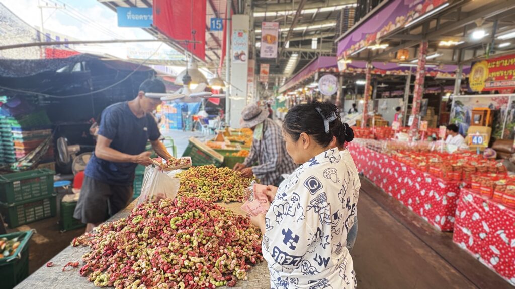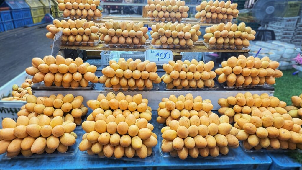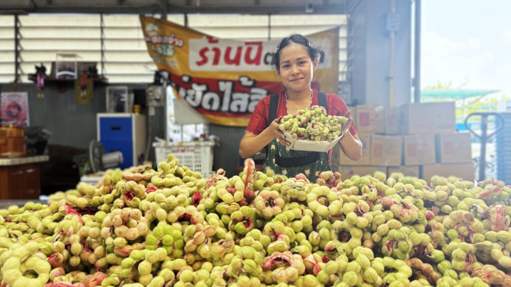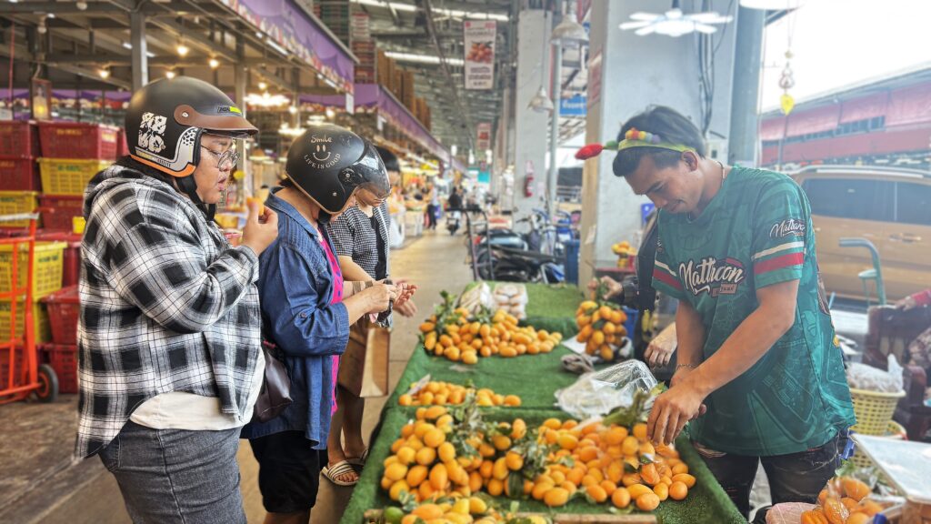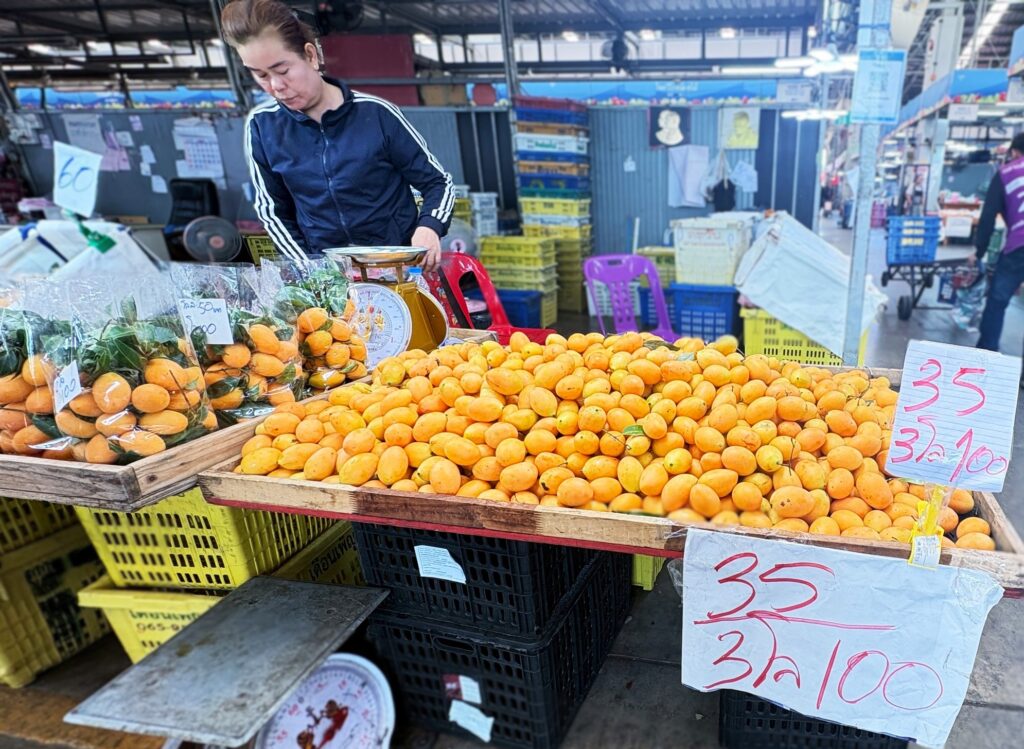 บรรยากาศการซื้อขายในโซนผลไม้ของตลาดสี่มุมเมืองคึกคัก หลังเข้าสู่ช่วงเดือนมีนาคมซึ่งเป็นช่วงผลผลิตออกมากที่สุดของปี โดยเฉพาะมะยงชิด ผลไม้ฤดูสั้นที่มีให้รับประทานเพียงปีละครั้ง ช่วงกุมภาพันธ์–มีนาคม ผลจะมีขนาดใหญ่ เนื้อแน่น รสหวานอมเปรี้ยว แหล่งปลูกสำคัญมาจากจังหวัดนครนายกและพิจิตร ก่อนที่ผลผลิตจะเริ่มลดลงในช่วงต้นถึงกลางเดือนเมษายน ขณะที่มะขามเทศ ผลไม้ยอดนิยมในหน้าร้อน ก็กำลังอยู่ในช่วงที่มีรสชาติอร่อยที่สุดเช่นกัน โดยเฉพาะช่วงกุมภาพันธ์–มีนาคม ที่ฝักแก่จัด เนื้อฟู หวานมัน พันธุ์ที่ได้รับความนิยมคือเนื้อชมพู จากแหล่งปลูกสำคัญในจังหวัดสระบุรีและนครราชสีมา ซึ่งถูกส่งเข้าสู่ตลาดค้าส่งเพื่อกระจายไปยังผู้ค้ารายย่อยทั่วประเทศ