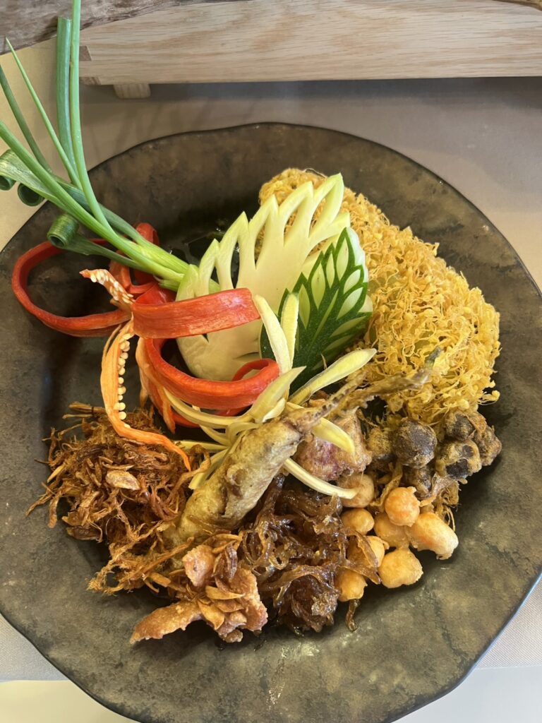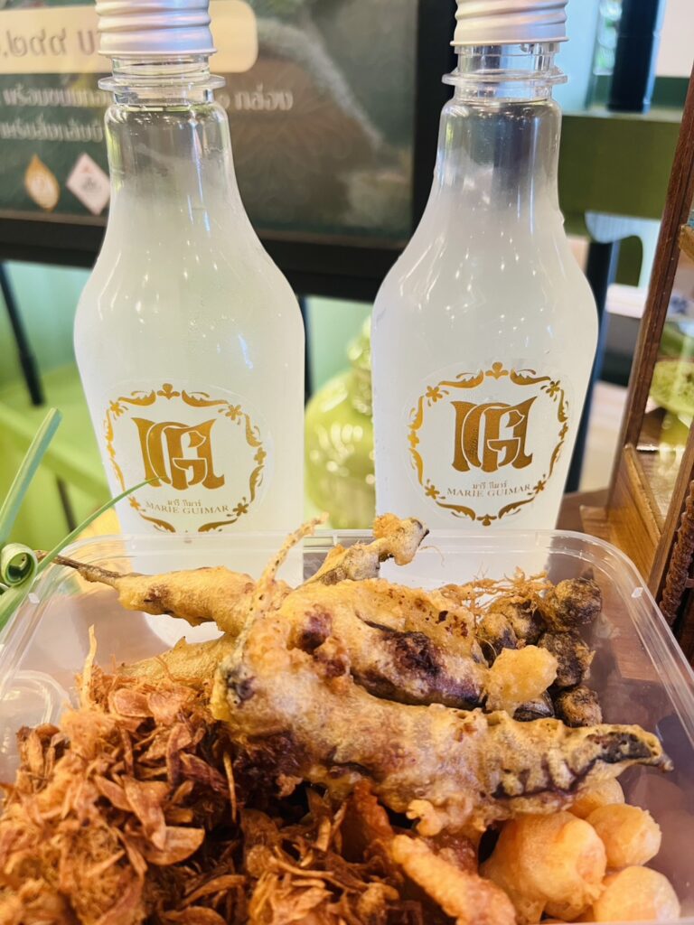 • ลูกกะปิหอมชุบไข่ทอด รับประทานคู่กระชายอ่อนแกะสลักเป็นดอกจำปา